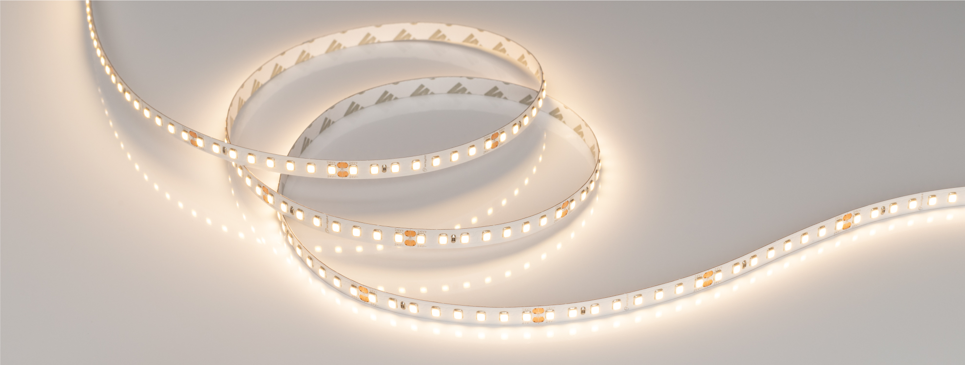 Светодиодные ленты RT A128 отличают высокая световая эффективность (150 лм/Вт) и равномерное свечение, что делает данные ленты универсальным решением для подсветки и освещения поверхностей, обладающих большой площадью. Тип светодиодов — 2835/3528 (А).
