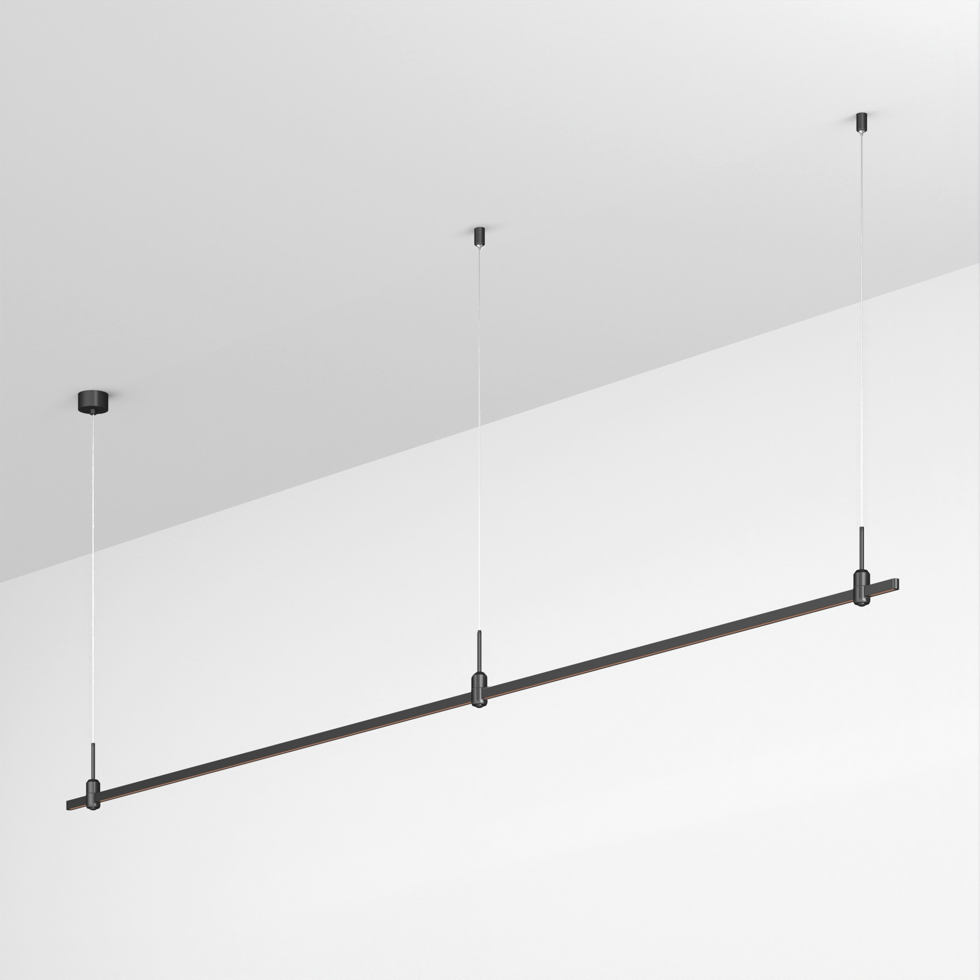 Подвесная линейная конструкция APRIORI. В комплекте трек с аксессуарами и гибкими подвесами длиной 1500мм. Размер ДxШxВ: 3000x17x22мм. Размер (с учетом заглушек) ДxШxВ: 3021x17x22мм. Монтируется подвесным способом. Для установки необходима фиксация на потолочной поверхности с использованием трех опорных точек подвеса. Шинопровод рассчитан на работу с безопасным напряжением DC48В. Изготавливается из алюминия, цвет черный Светильники и источники питания приобретаются отдельно.