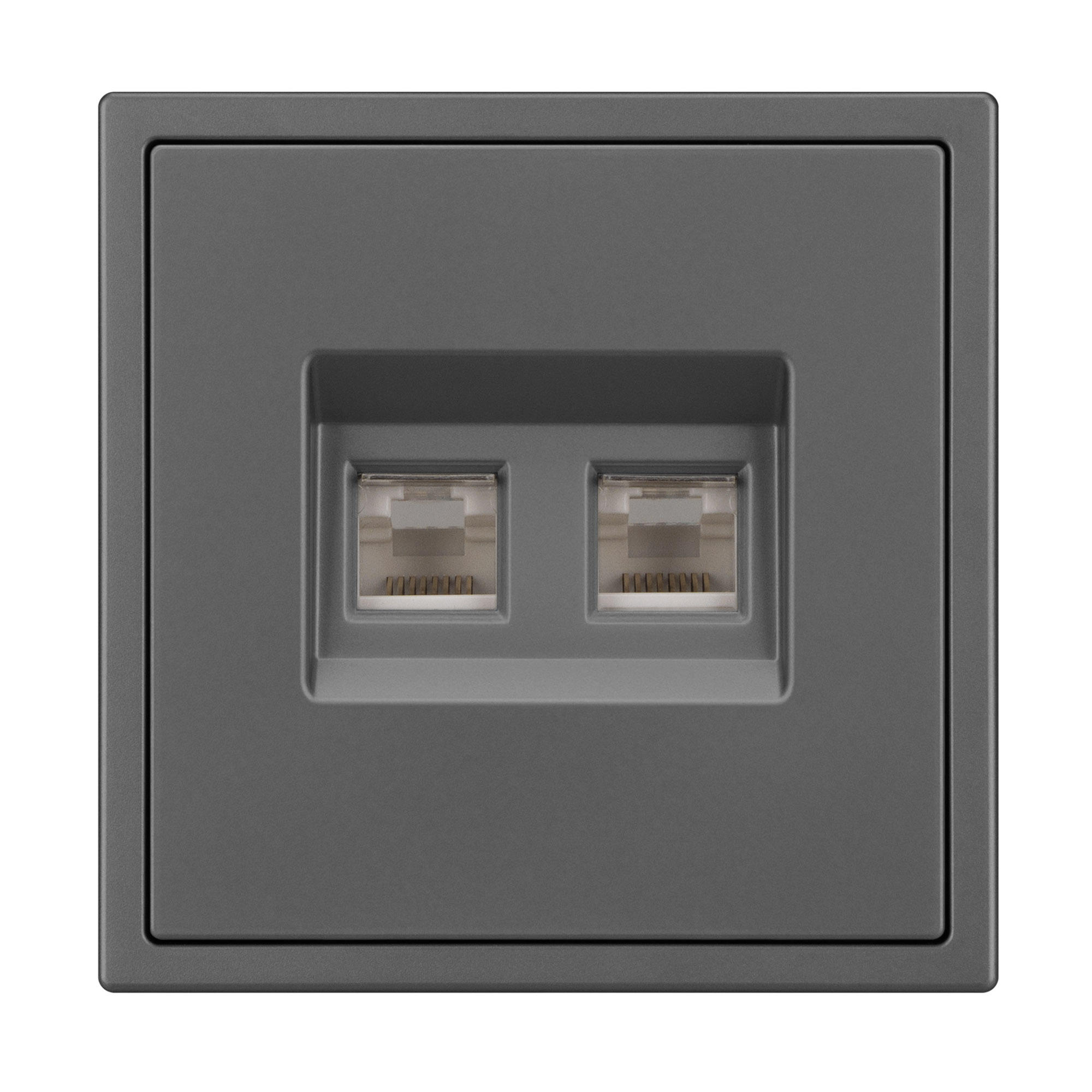 Механизм двойной телефонной розетки. Цвет - серый базальт, с Soft-Touch покрытием. Без фронтальной рамки. Уровень пылевлагозащиты IP20. Тип подключаемого разъема - RJ11. Розетка устанавливается в стандартный подрозетник круглого сечения диаметром 60мм. Габаритные размеры: длина 71 мм, ширина 71 мм, высота 42 мм. Гарантийный срок 10 лет.