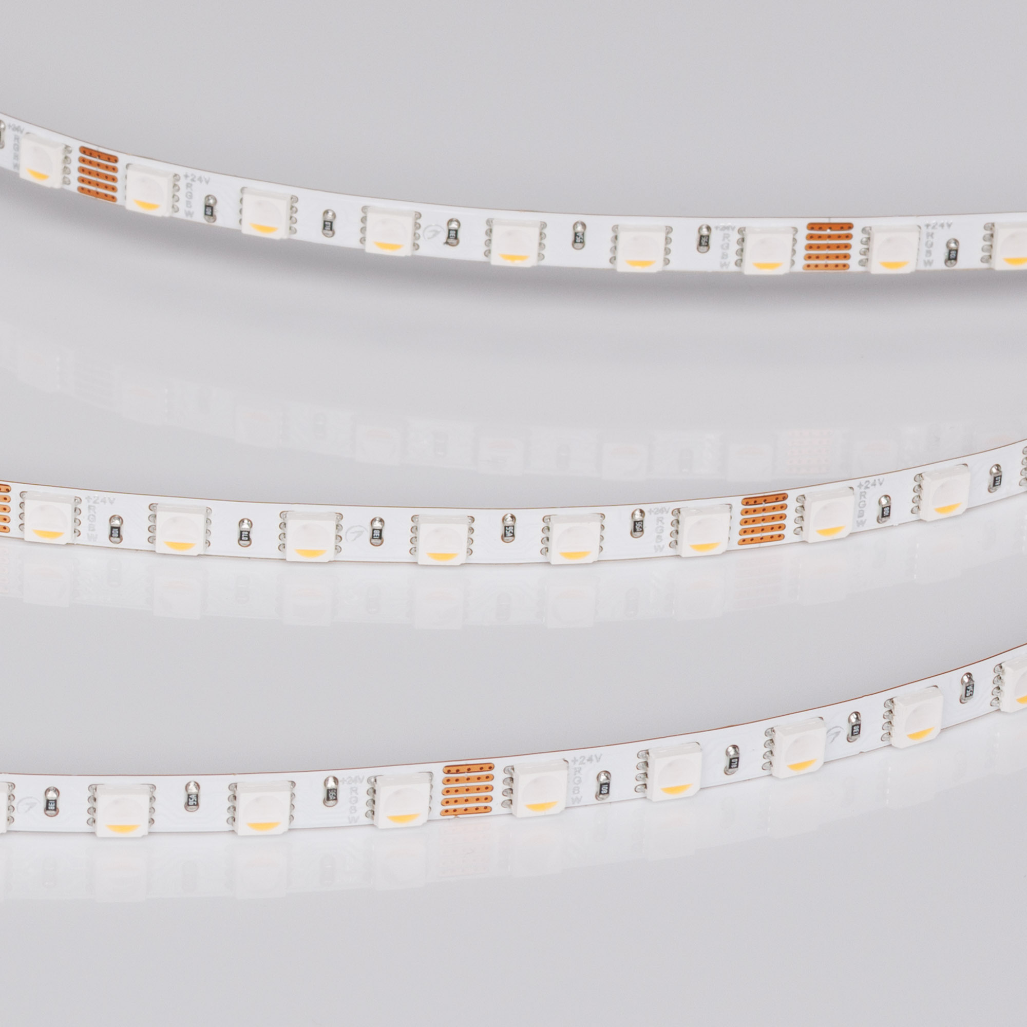 Светодиодная лента RT серии H96 с узкой платой 5 мм. Светодиоды SMD 4040, 96 шт/м, цвет свечения RGBW, теплый 3000K, четыре кристалла в одном корпусе. Четырехканальная лента с пятью проводами для подключения, управляется RGBW контроллером. Применяется для декоративной интерьерной подсветки ниш, витрин, мебели, стеклянных полок. Узкая плата 5 мм позволяет устанавливать ленту в тонкий паз, создавая тонкие световые линии. Обязательна установка на алюминиевый профиль.