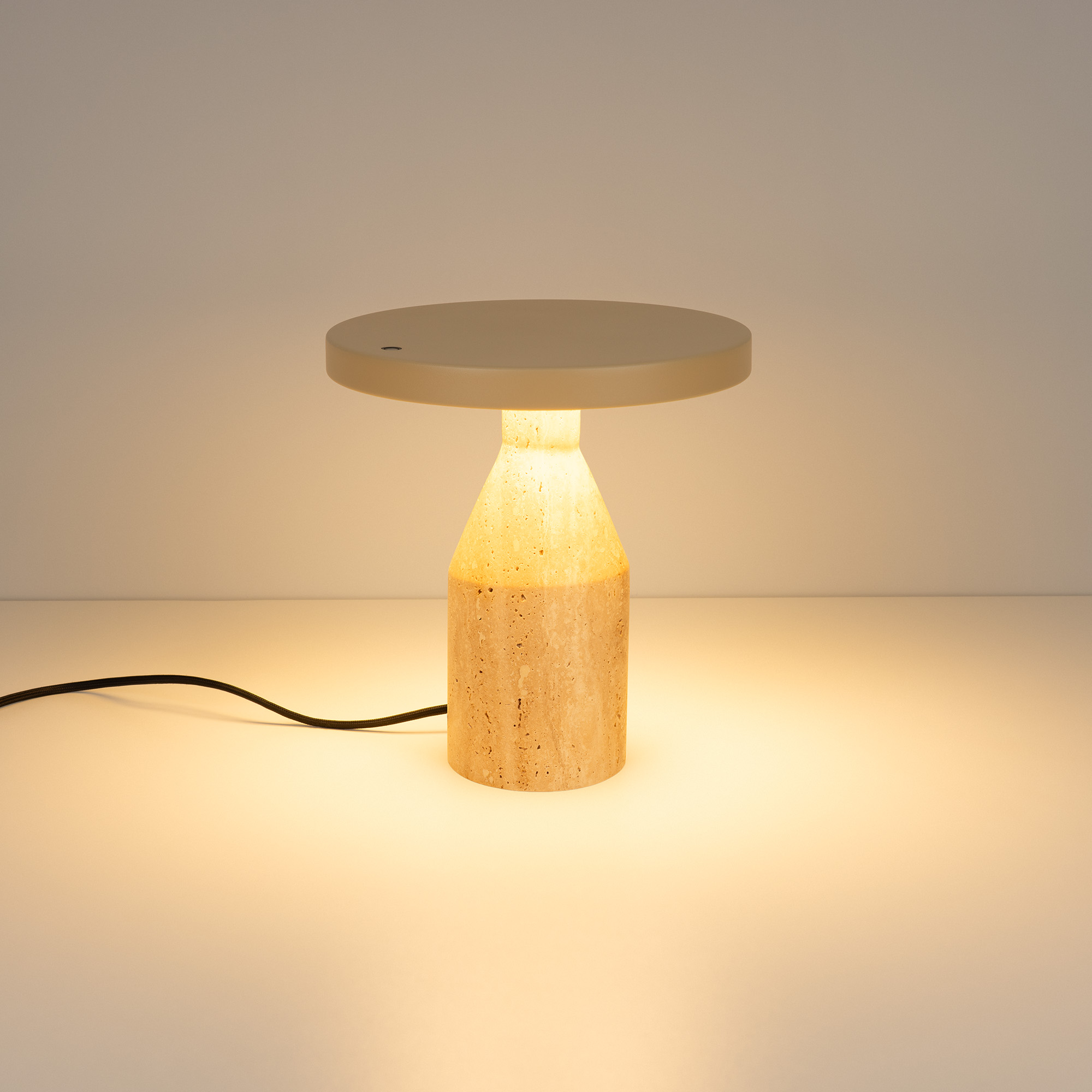 Настольный светильник CROOD. С изменяемой цветовой температурой 2700/3200/4000K, переключается коротким нажатием на сенсорную кнопку на плафоне, диммирование происходит за счет ее удержания. Мощность 7 Вт, св. поток 159 лм, 23 лм/Вт, CRI>94, угол 140°, напряжение питания 230 В. Бежевый плафон из алюминия, основание из травертина, степень защиты IP20. Общая высота 240 мм. Габариты светового модуля DхH: 225 x 22 мм. Габариты основания DхH:: 100 x 220 мм. Пульсация <1%.