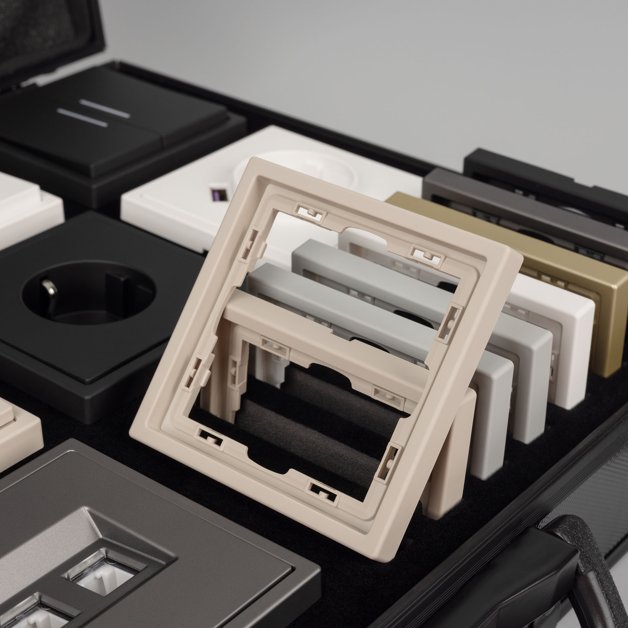 Рамки серии NOBE в цветах Белый кварц, Черный оникс, Золотой песок и Серый базальт. Поверхность рамок имеет Soft-Touch покрытие:
