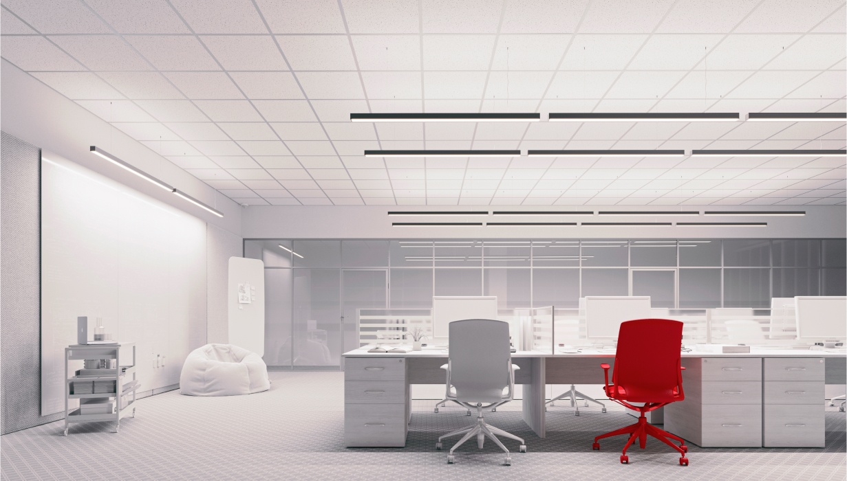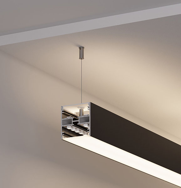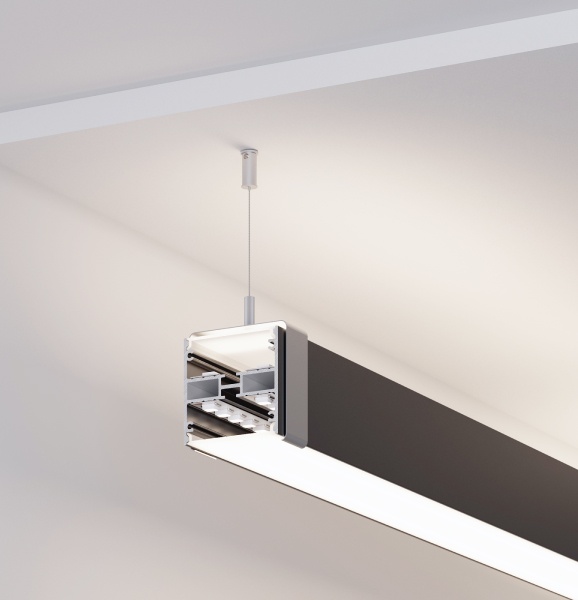 Подвесной линейный светильник со свечением вверх и вниз — отличный вариант для кабинетов и офисов. Направленное вниз свечение создает локальный акцент на рабочей поверхности, а направленное вверх — отражается от потолка, образуя мягкое основное освещение без резких теней.