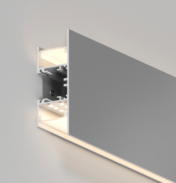Создавайте настенные светильники и декоративную подсветку стен с помощью новых профилей серии WALL — две модели с эффектом отраженного света со свечением вниз или вверх, а также с двусторонним свечением.