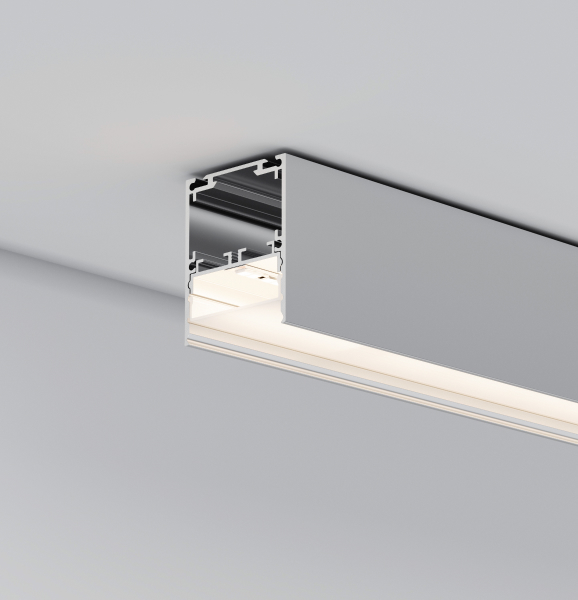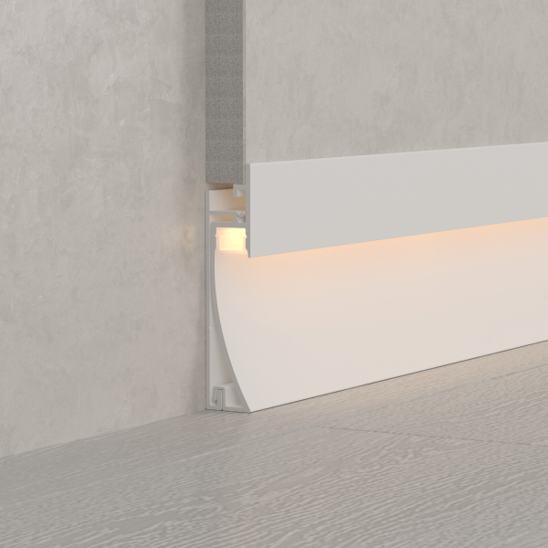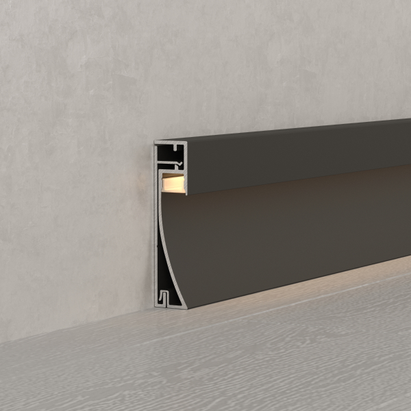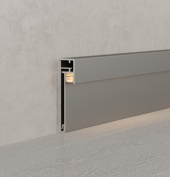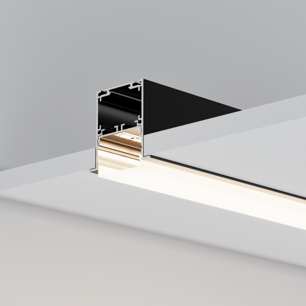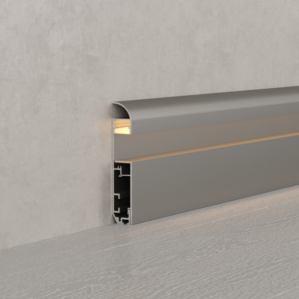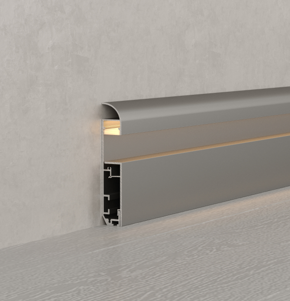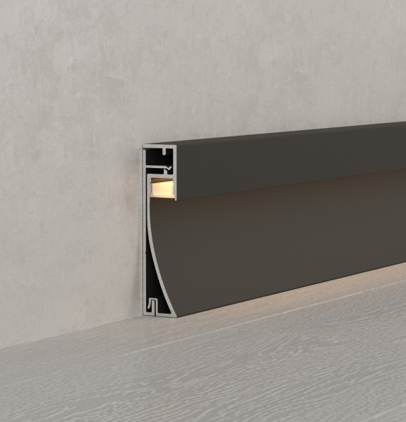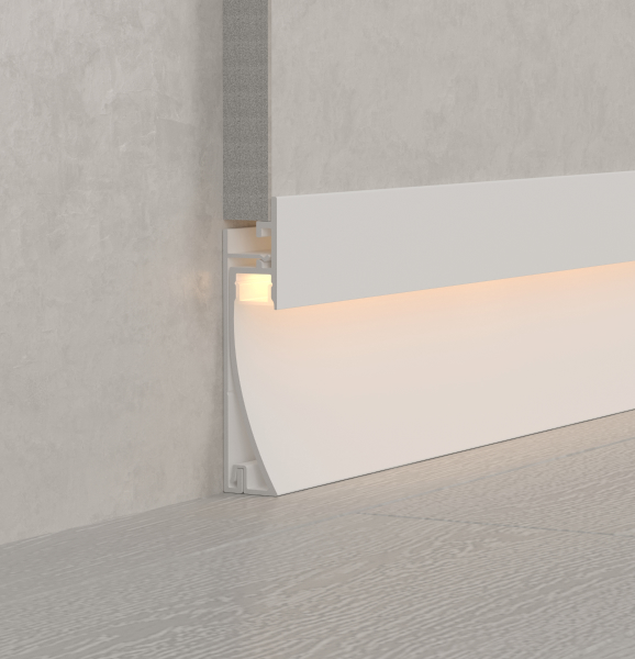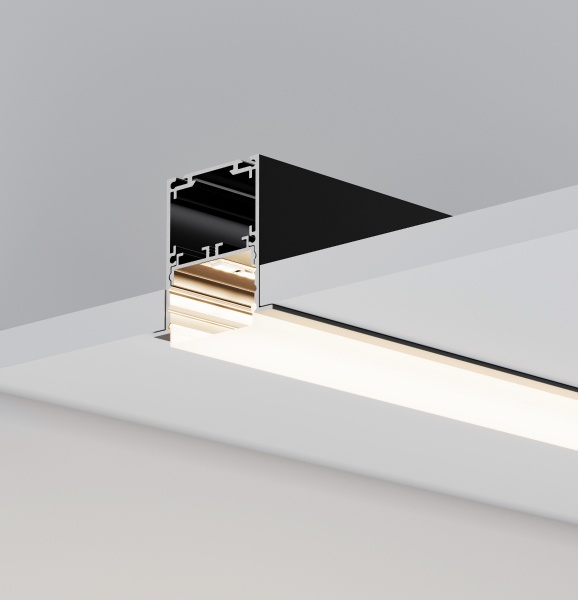 Среди новинок — накладные двухкомпонентные профили-плинтусы, а также встраиваемые модели с накладным фланцем. Различные варианты расположения площадки для ленты позволяют подобрать подходящий световой эффект.