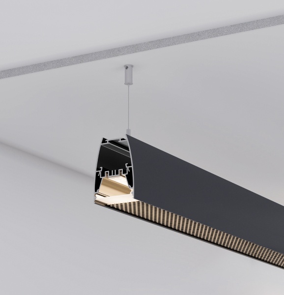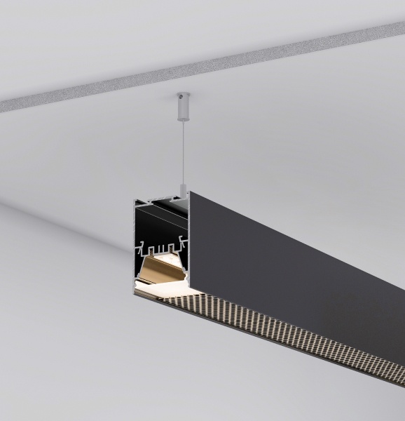 Создайте линейный светильник с комфортным уровнем освещения на основе новых профилей LINE 5075 HONEYCOMB в черном цвете. Популярный размер, современный дизайн и функциональность конструкции профилей LINE 5075 HONEYCOMB отлично подходят для организации основного и локального освещения.