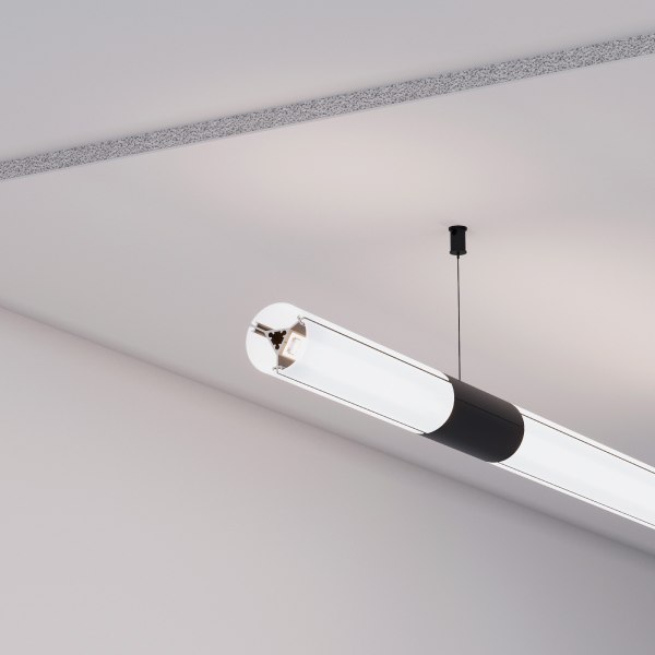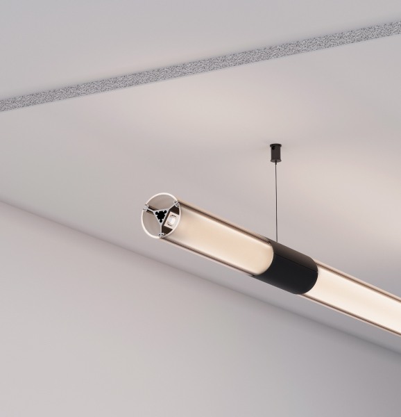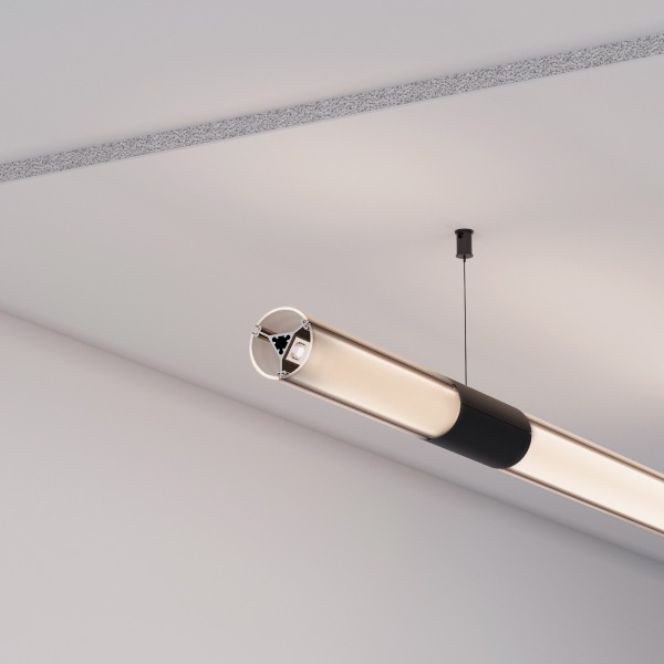 Подвесной профиль ROUND D36 с тонкими черными гранями на круглом корпусе — сочетание стиля и функциональности. Профиль имеет три площадки для установки светодиодных лент, что обеспечивает свечение 360 градусов.