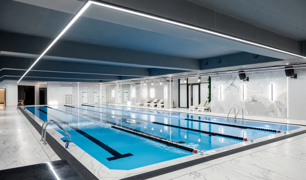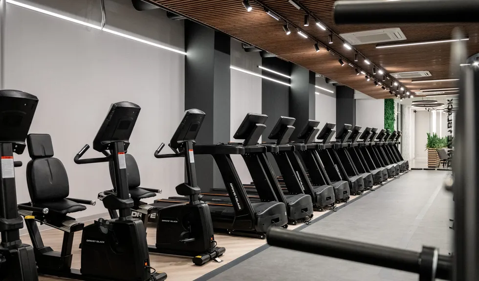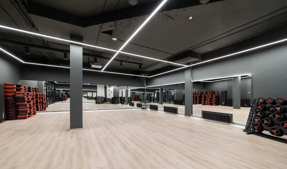 В большинстве помещений фитнес-центра на потолках можно увидеть открытые коммуникации: подвесные линии света не только легко устанавливаются в данных условиях, но и перетягивают на себя внимание от несовершенств потолков.