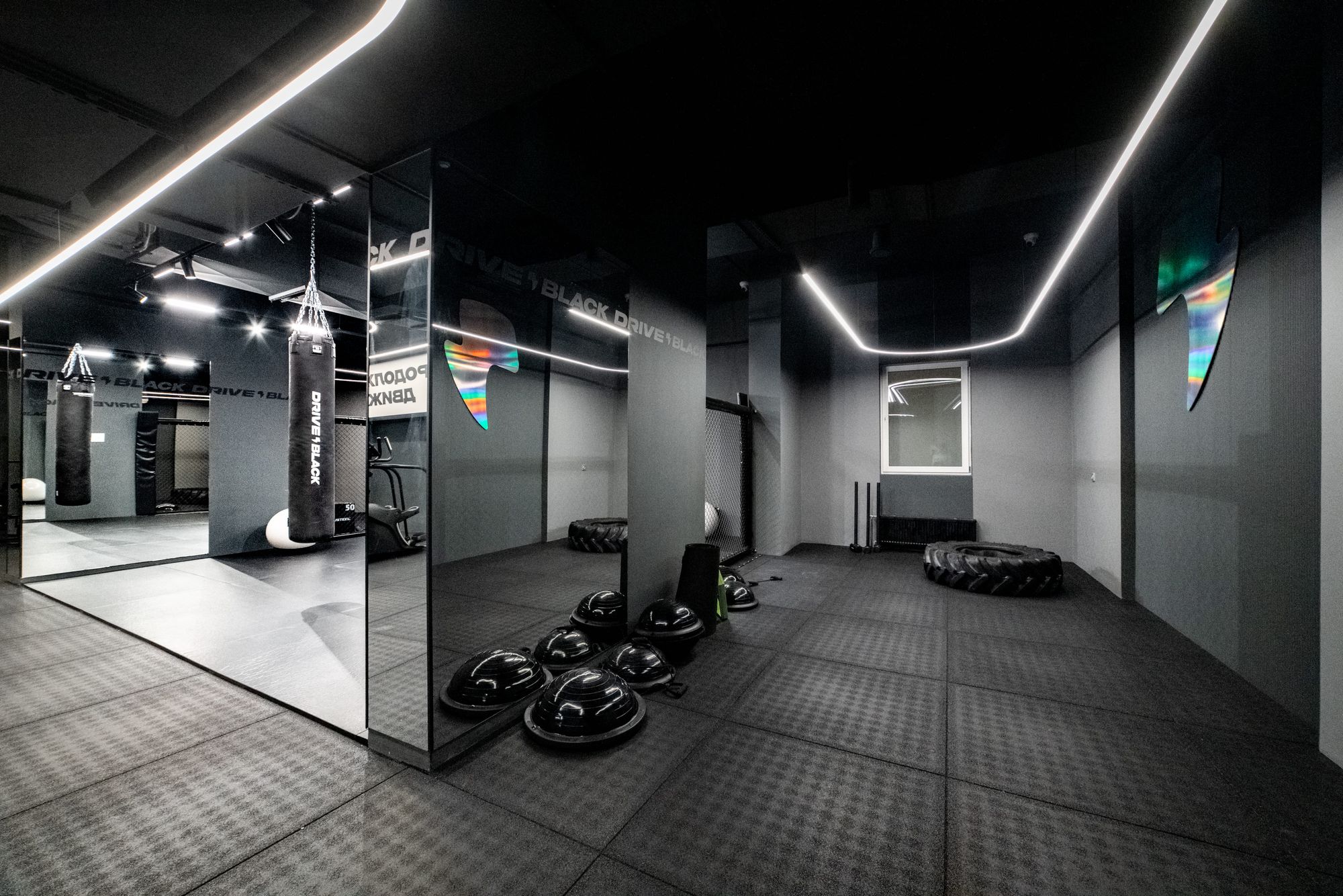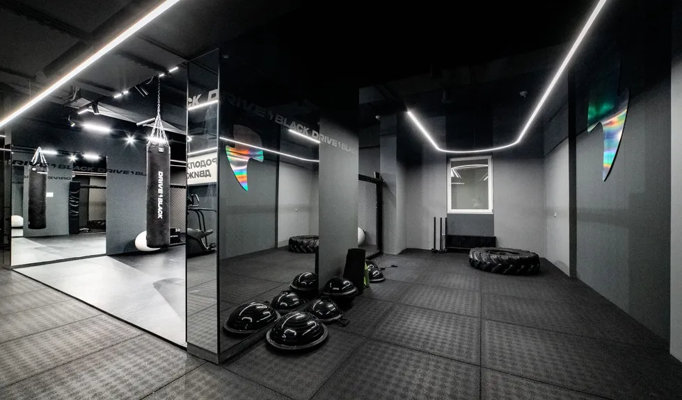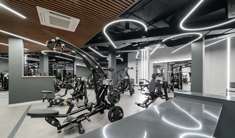 Пространство фитнес-клуба премиум-класса Drive Black пронизано световыми линиями, которые словно ведут клиента за собой. За счет радиусных моделей профиля ARC и широких лент RZ с платой в форме волны удалось создать плавные повороты линий света и полукруглые композиции.