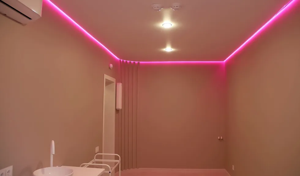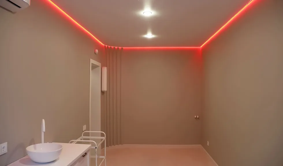 Свет в интерьере клиники соответствует общей концепции дизайна. В отделке использованы холодные оттенки белого и серого, которые подчеркиваются нейтральным дневным светом (4000 К).
