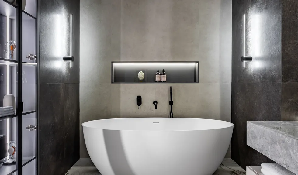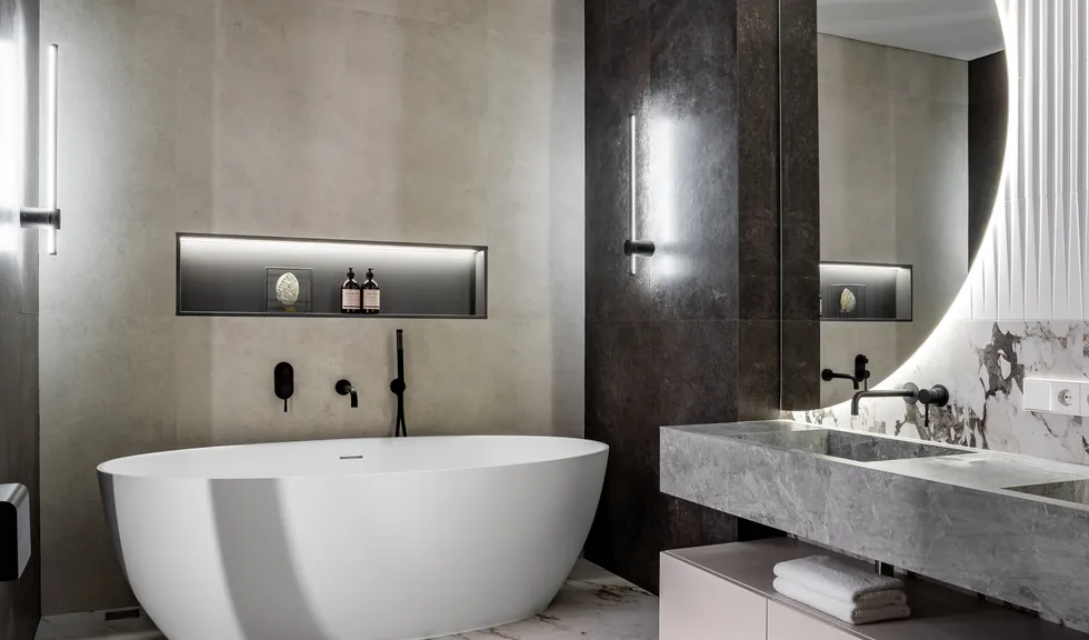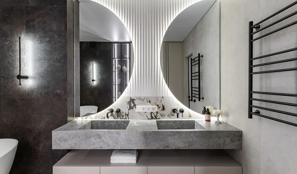 Герметичная лента RTW используется в ванной: оригинальные полукруглые зеркала, а также подиум и ниши подсвечены дневным белым светом, делая пространство ванной светлым, удобным и безопасным.