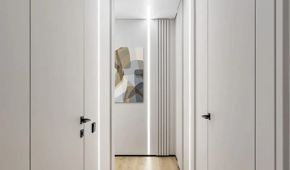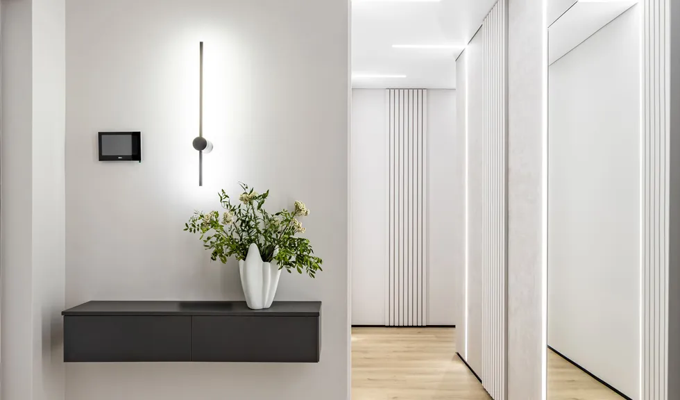 В интерьере очень много световых линий на основе светодиодных лент RT, RTW и UL в сочетании с профилями SL и LINE. В ванной линии света пронизывают задние поверхности прозрачных стеклянных шкафов, что обеспечивает одновременно футуристическую и комфортную атмосферу. В коридоре световые линии рифмуются с реечным декором стен, работая на ощущение светлого, легкого, вытянутого по вертикали пространства. Переходя со стен на потолок, они создают оригинальные Г-образные формы.