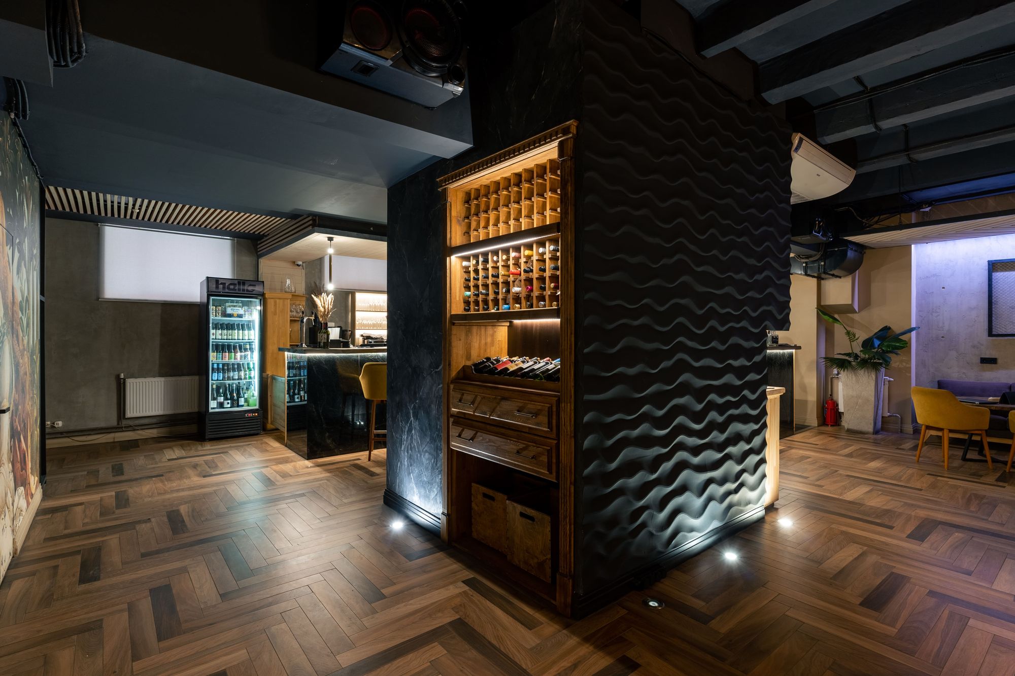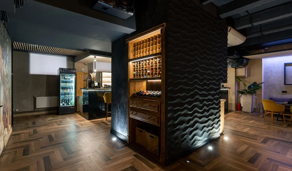В проекте также предусмотрено расширенное управление освещением. Специальный контроллер управляет цветом свечения RGBW-лент, что позволяет мгновенно изменять атмосферу в баре.