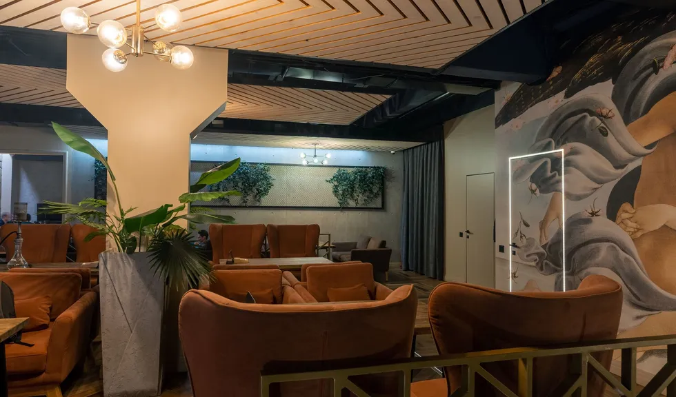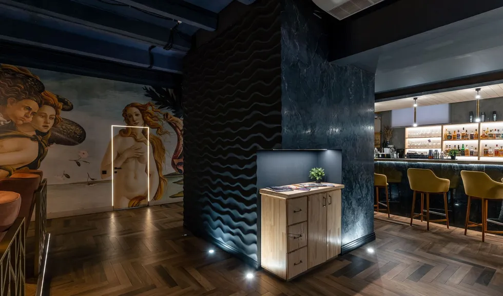Особое внимание привлекает стена, полностью расписанная под картину «Рождение Венеры» Боттичелли. Контурная подсветка дверей не только выполняет навигационную функцию, но и создает ощущение, что из-под картины просачивается солнечный свет.