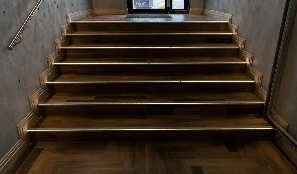 Хочется отметить подсветку лестницы, ведущей в зал. Края ступенек не только хорошо видны в полумраке, но и снабжены противоскользящей вставкой.
