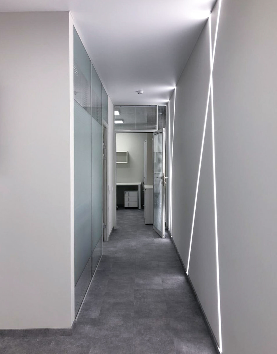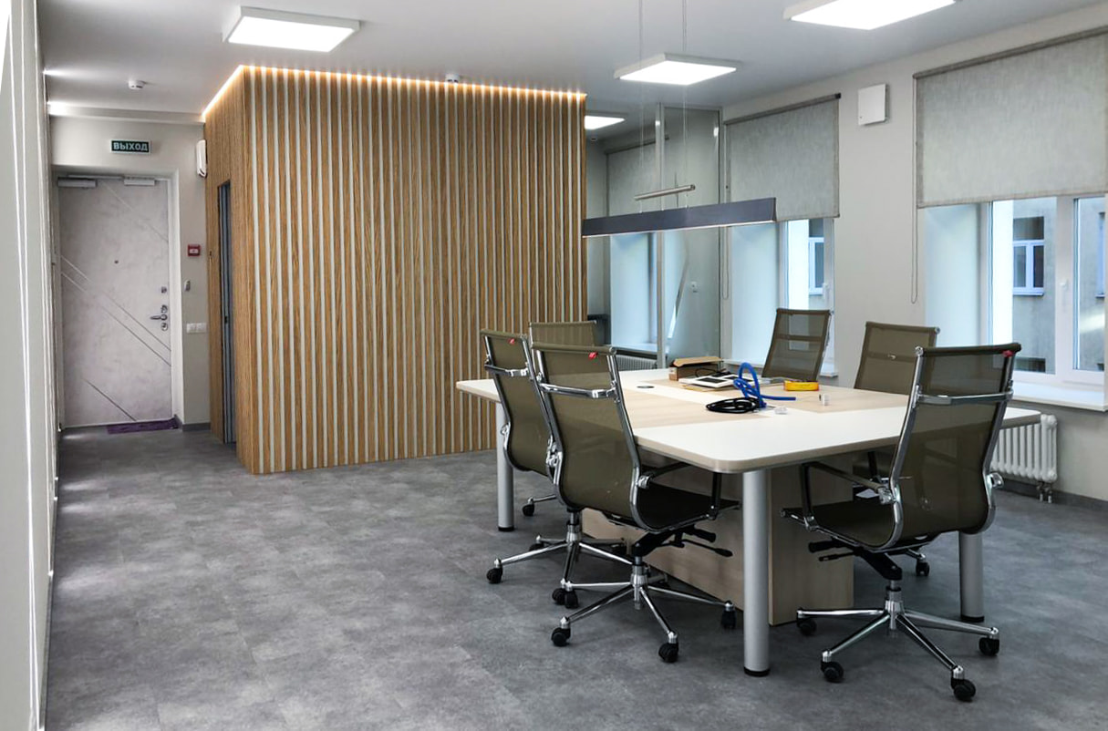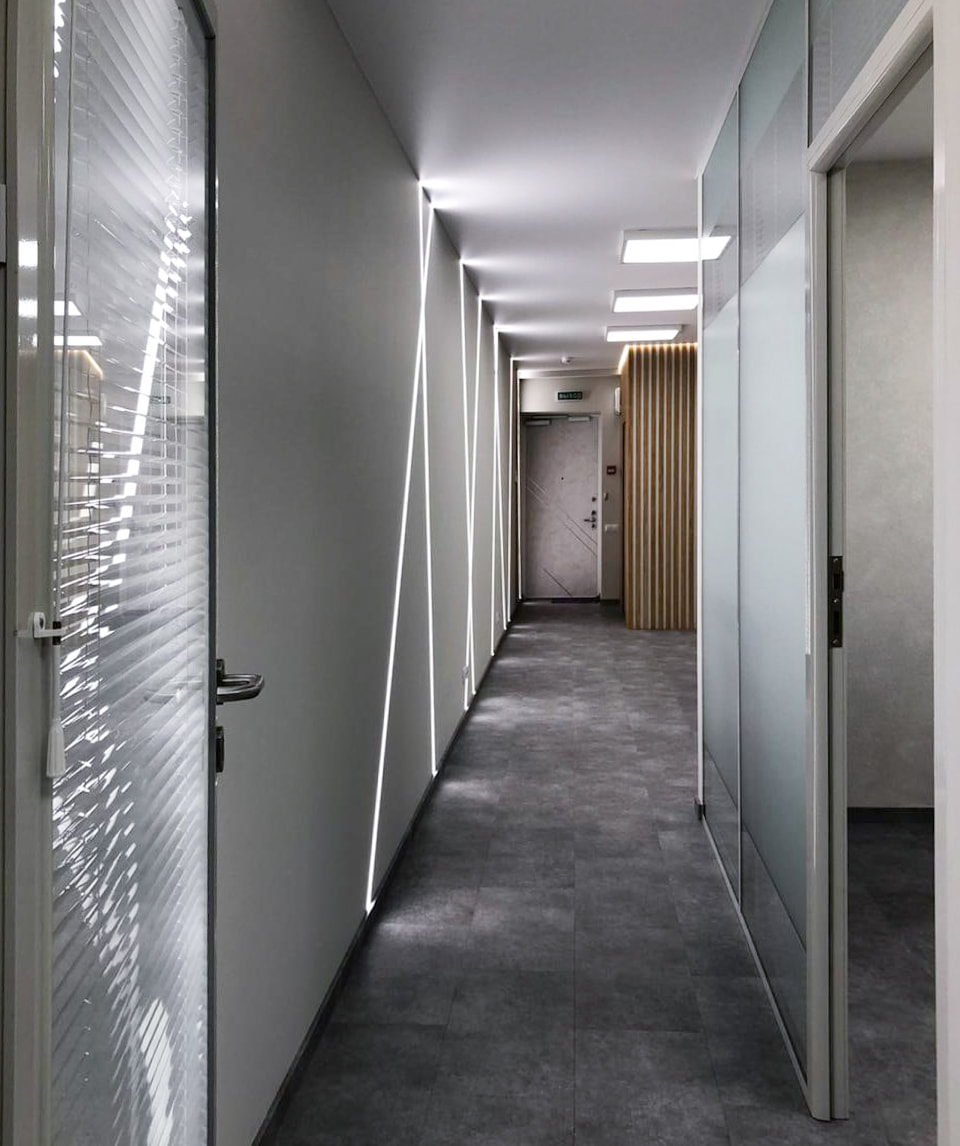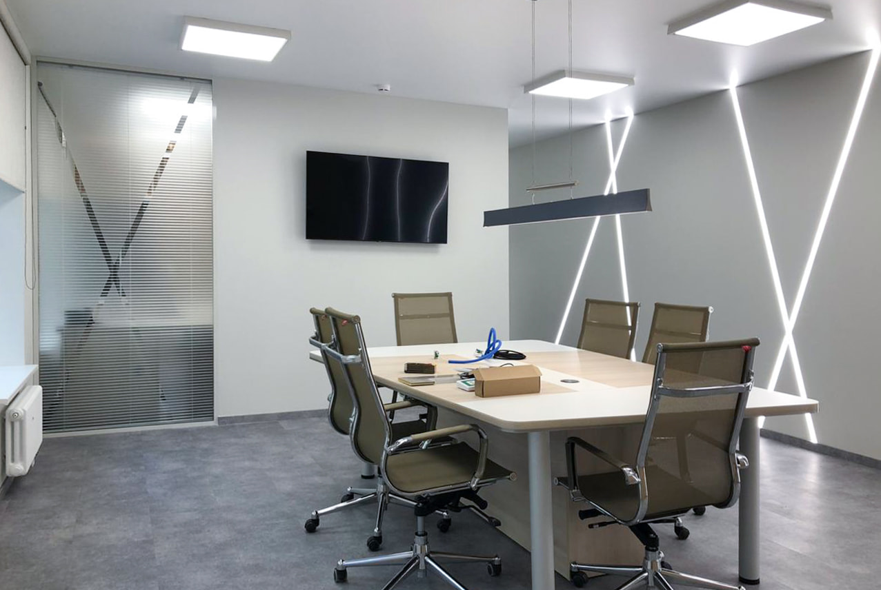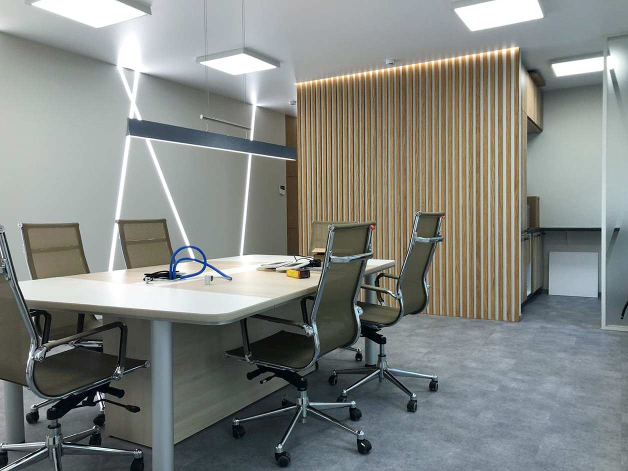 Чтобы создать достаточный уровень освещенности в разных помещениях, использовали разные по интенсивности и назначению источники света. Для основного освещения — накладные потолочные панели. Над столом для переговоров — лаконичный линейный светильник, выполненный из профиля черного цвета. Освещение в этом проекте выполняет не только основную функцию, но и выступает в качестве оригинального декора. Самая длинная стена офиса эффектно подчеркнута тонкими пересекающимися линиями света, которые создают на поверхности динамичный графический рисунок. В остальных помещениях реализована подсветка с теплым белым свечением, создающая уютную атмосферу. За счет использования разных источников света в каждом помещении офиса получилось создать логичную и оригинальную систему освещения, которая комфортна для сотрудников и посетителей.