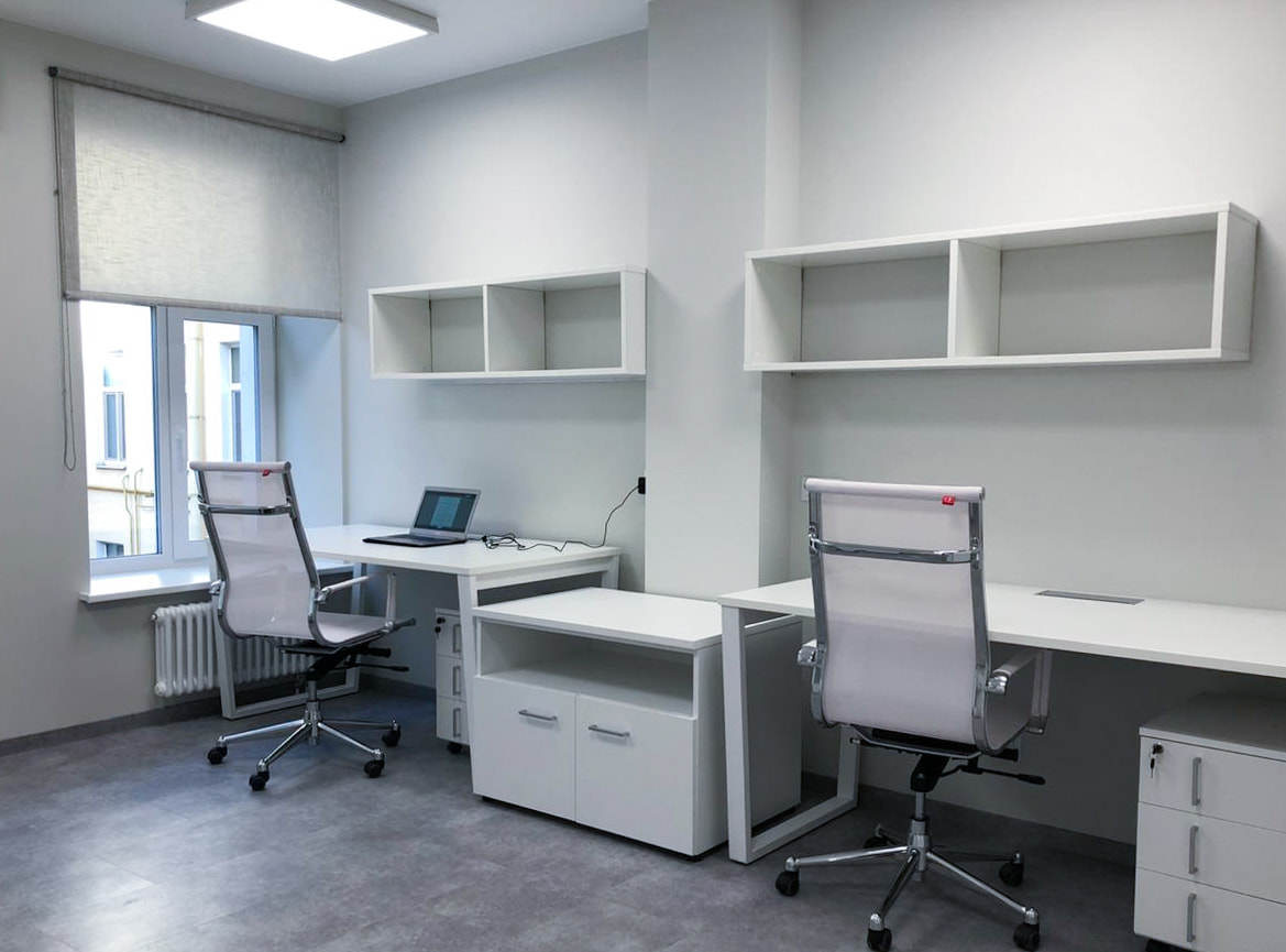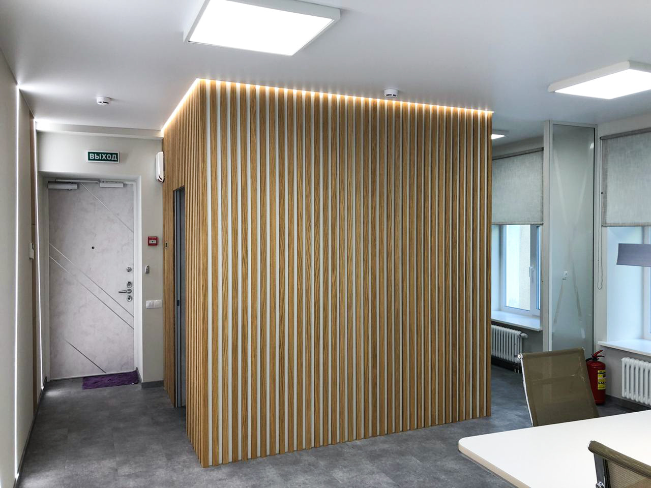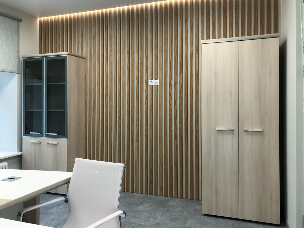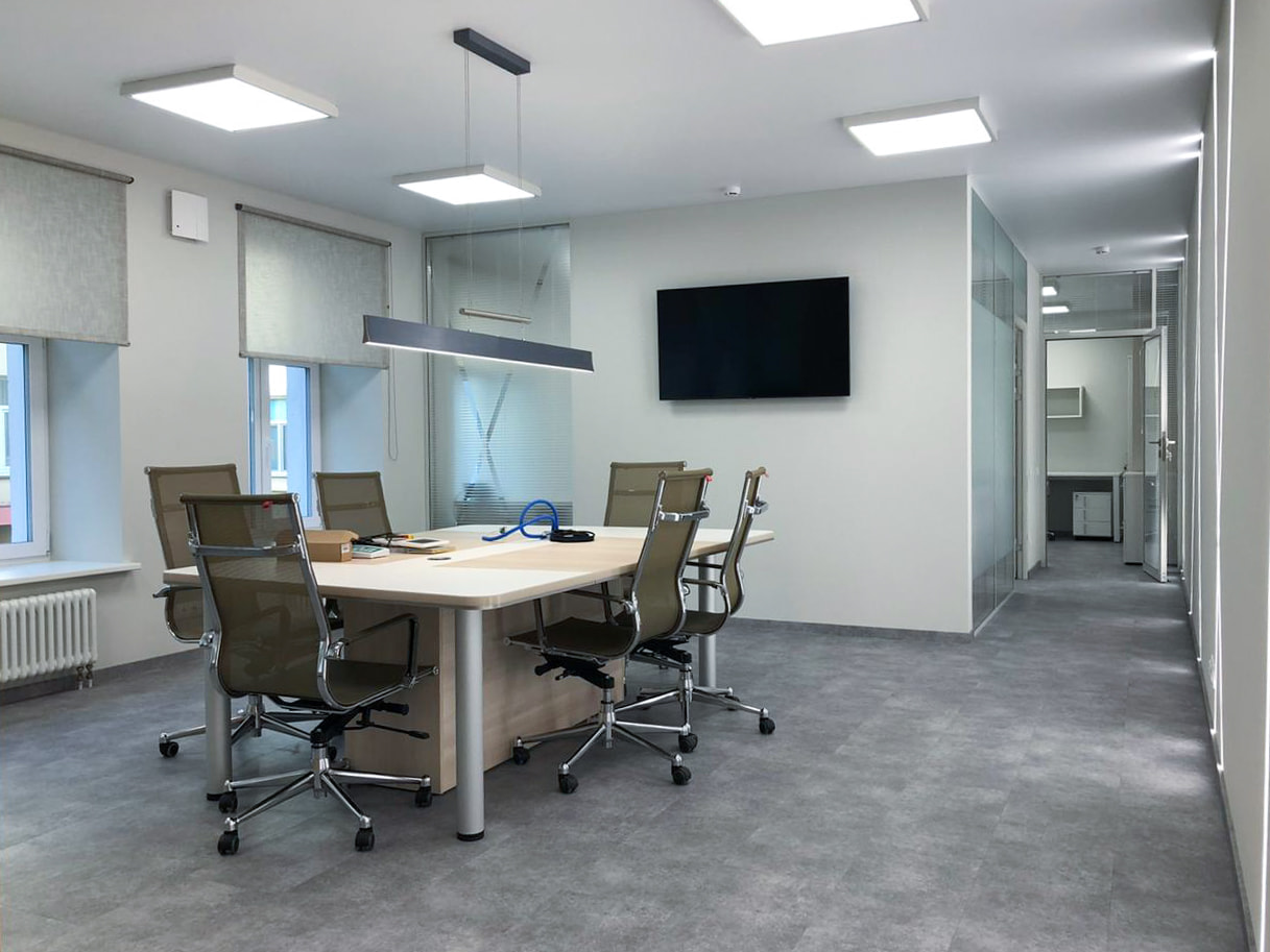 Чтобы создать достаточный уровень освещенности в разных помещениях, использовали разные по интенсивности и назначению источники света. Для основного освещения — накладные потолочные панели. Над столом для переговоров — лаконичный линейный светильник, выполненный из профиля черного цвета. Освещение в этом проекте выполняет не только основную функцию, но и выступает в качестве оригинального декора. Самая длинная стена офиса эффектно подчеркнута тонкими пересекающимися линиями света, которые создают на поверхности динамичный графический рисунок. В остальных помещениях реализована подсветка с теплым белым свечением, создающая уютную атмосферу. За счет использования разных источников света в каждом помещении офиса получилось создать логичную и оригинальную систему освещения, которая комфортна для сотрудников и посетителей.