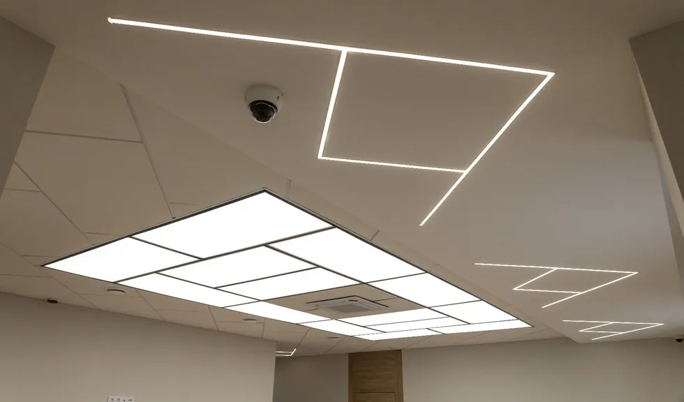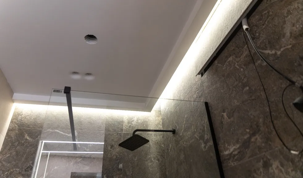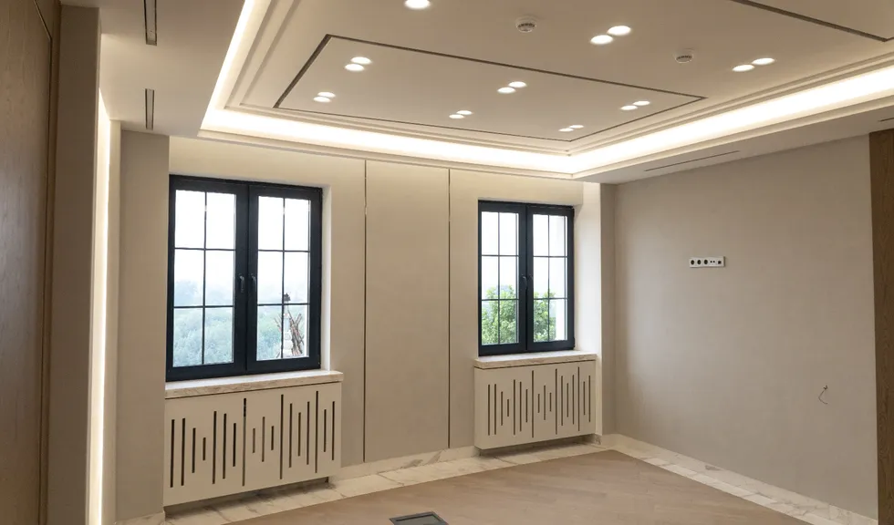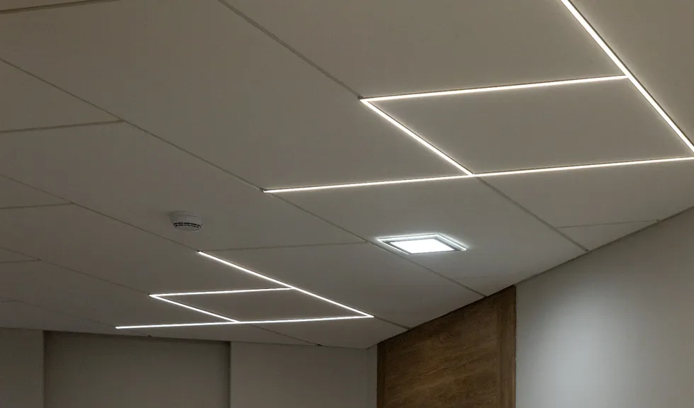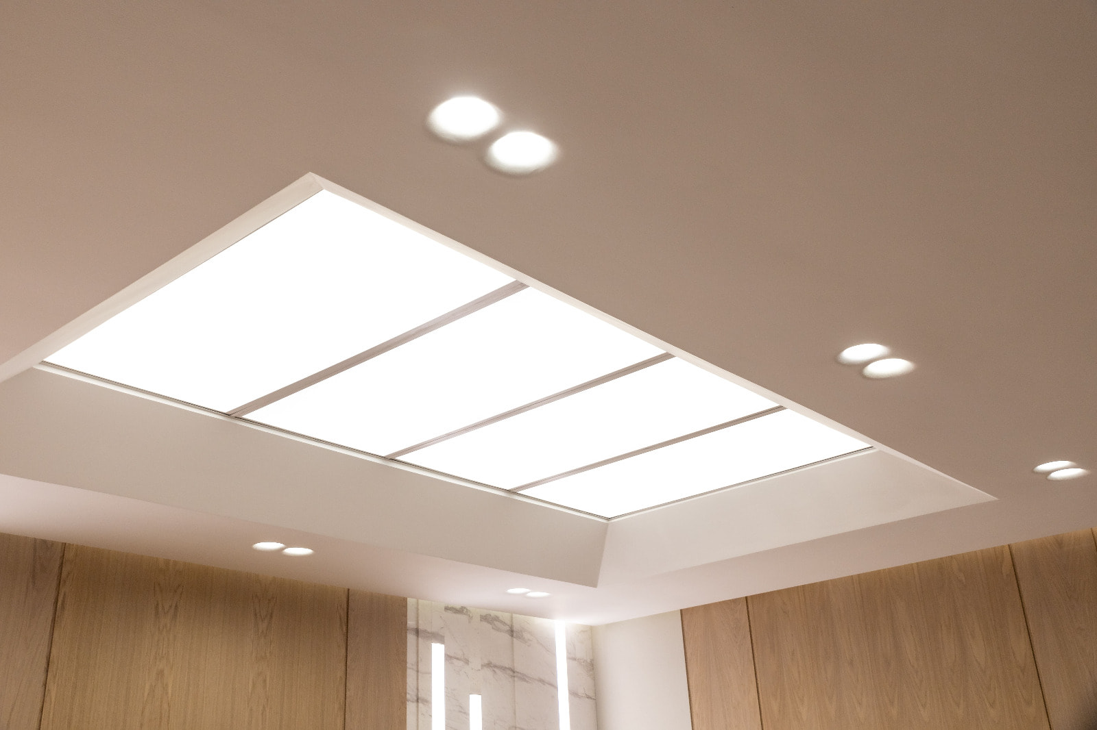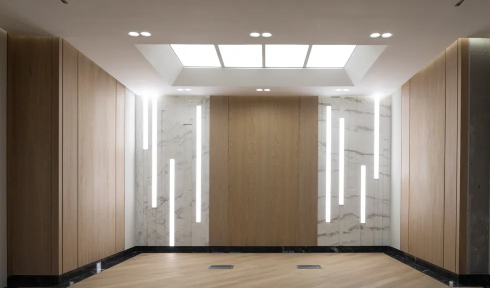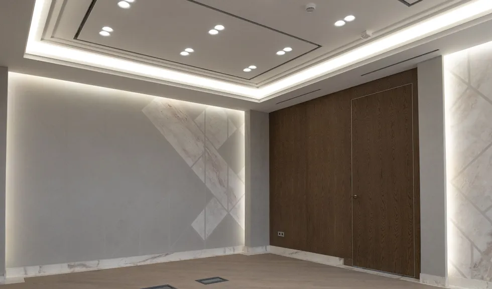 Для данного проекта под заказ были созданы светильники SP LINE на основе профиля разной формы и длины. Прямые линии отлично смотрятся между деревянных реек на потолке и в мраморных панелях, а крупная прямоугольная композиция подчеркивает геометрию комнаты.