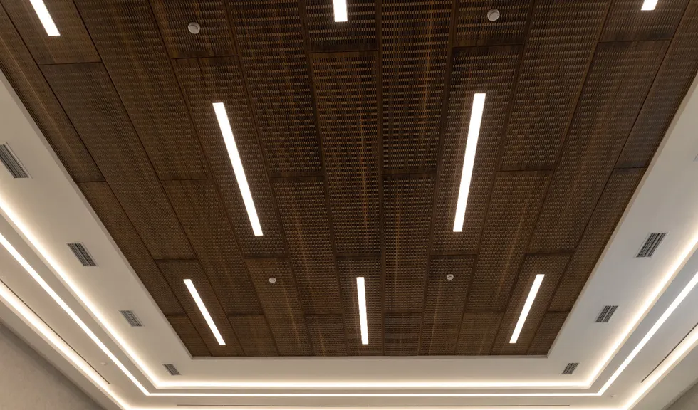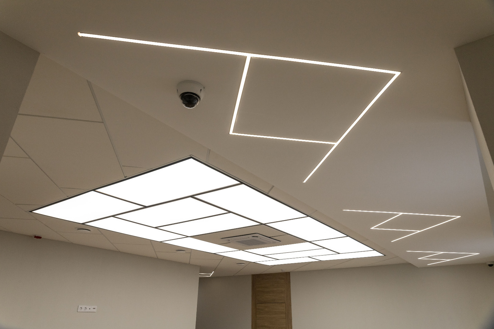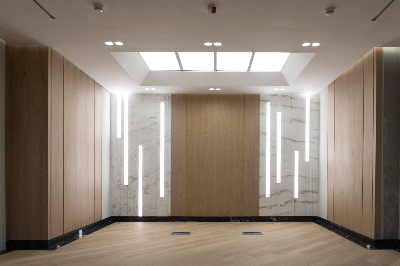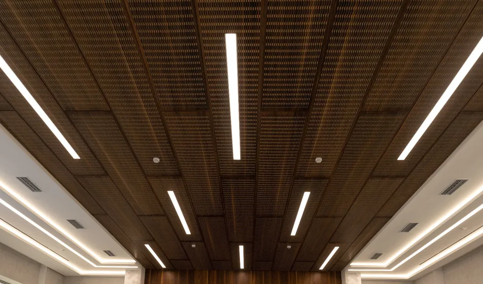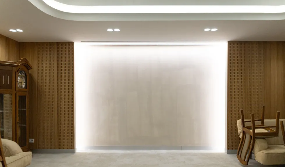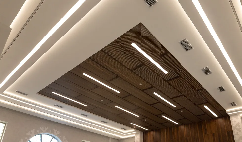 Для данного проекта под заказ были созданы светильники SP LINE на основе профиля разной формы и длины. Прямые линии отлично смотрятся между деревянных реек на потолке и в мраморных панелях, а крупная прямоугольная композиция подчеркивает геометрию комнаты.