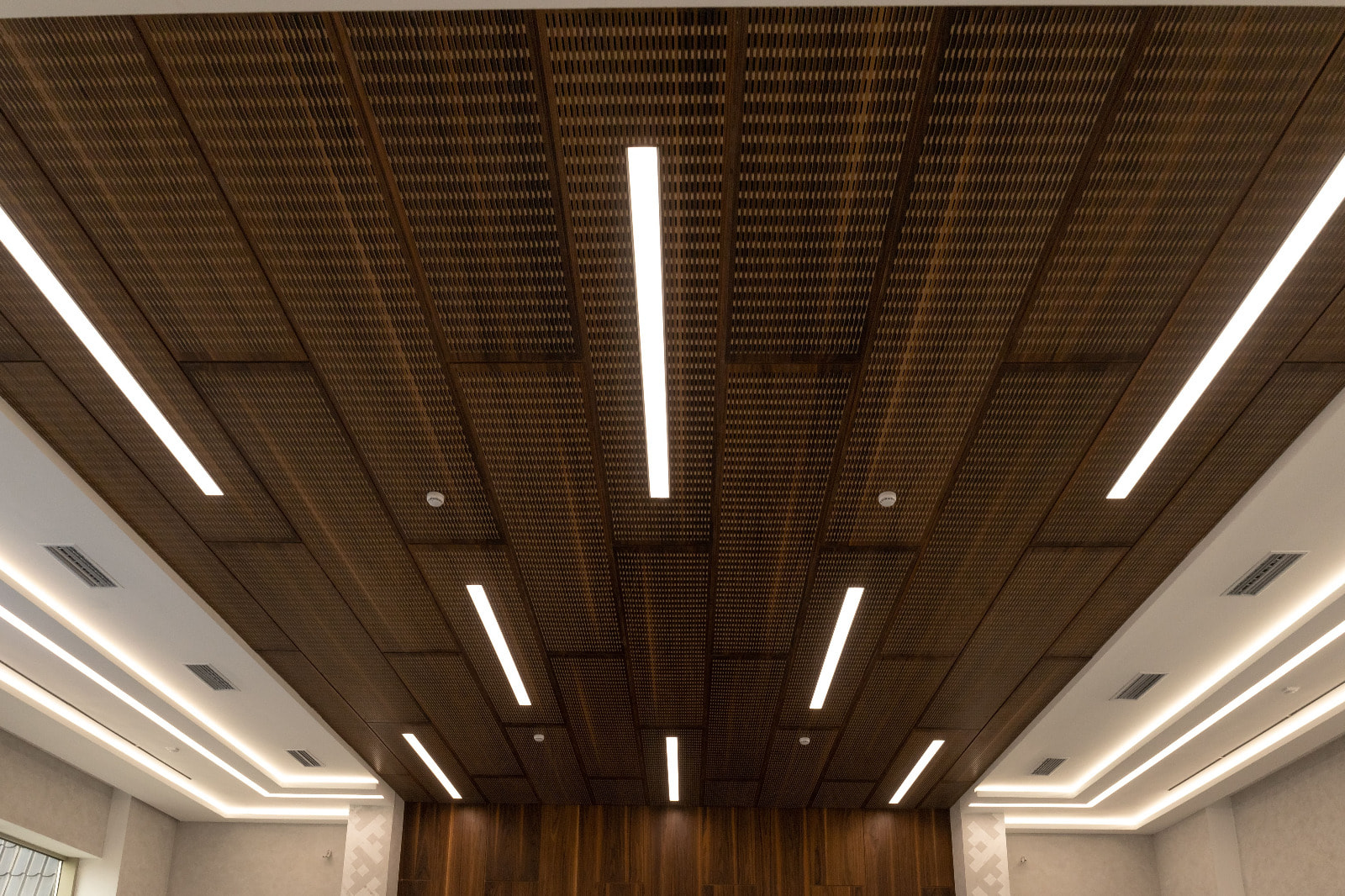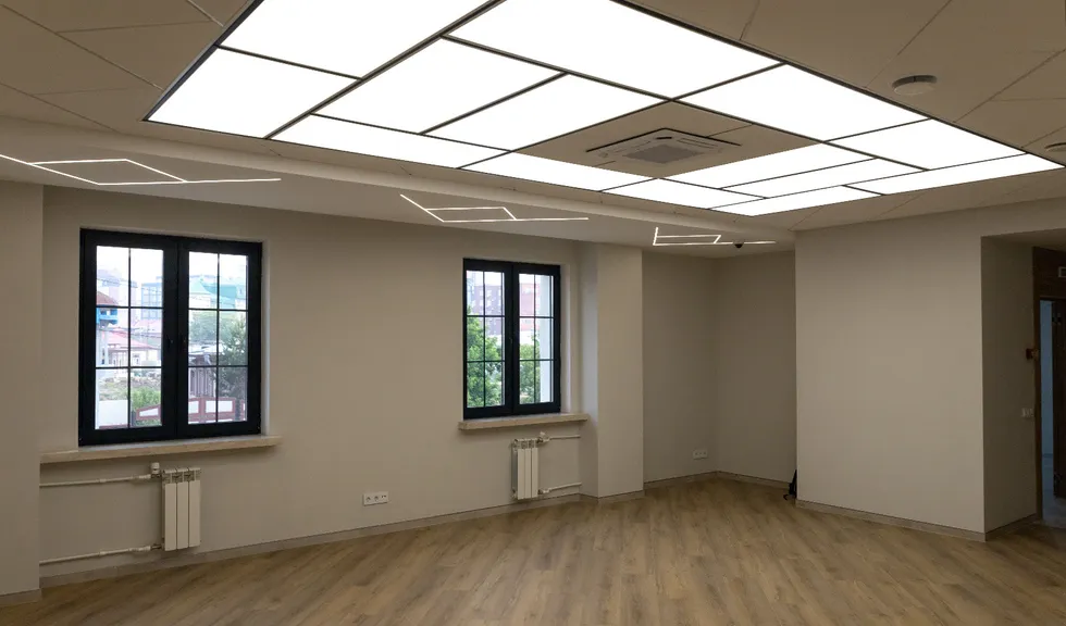 После капитального ремонта интерьер здания представительства ЯНАО стал более стильным, современным и в то же время — респектабельным. Разнообразные линии света — один из основных источников освещения в интерьере. Они не только создают освещение разных типов — от основного до декоративного, — но и повторяют геометрию отделки, тем самым гармонично вписываясь в пространство.