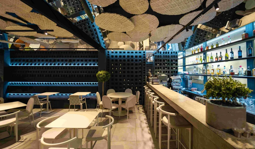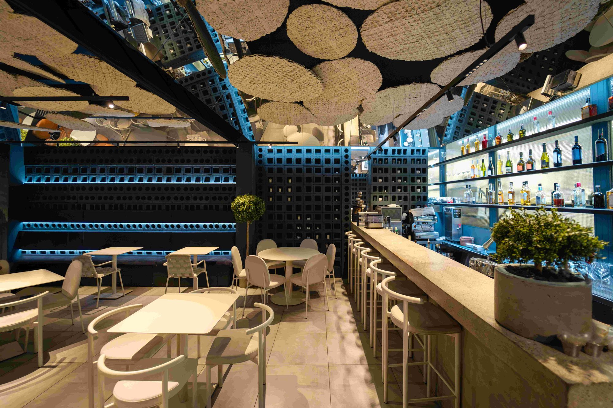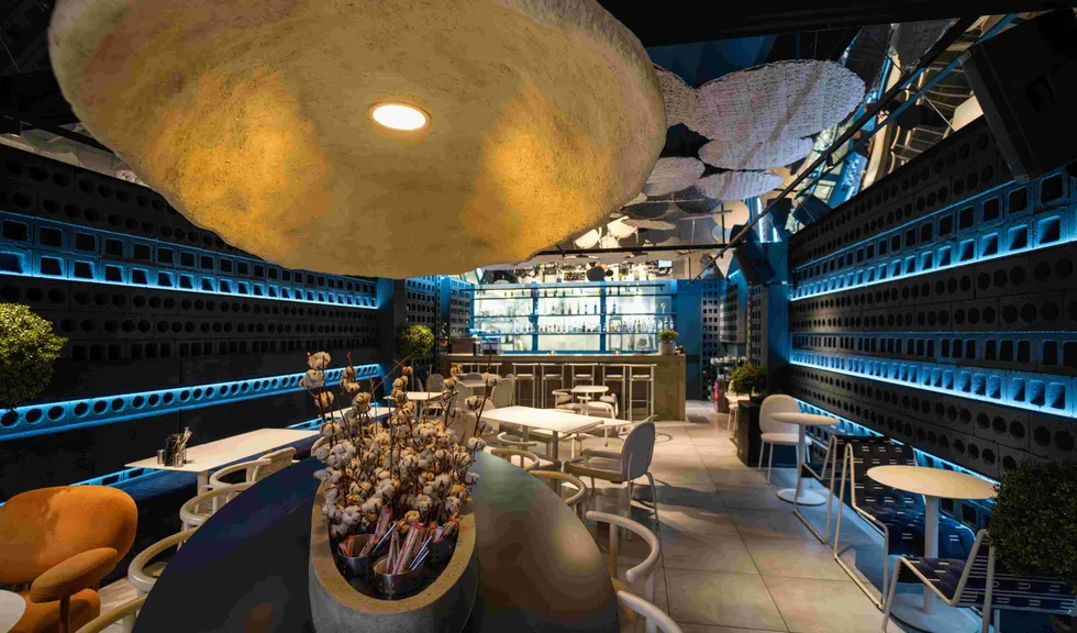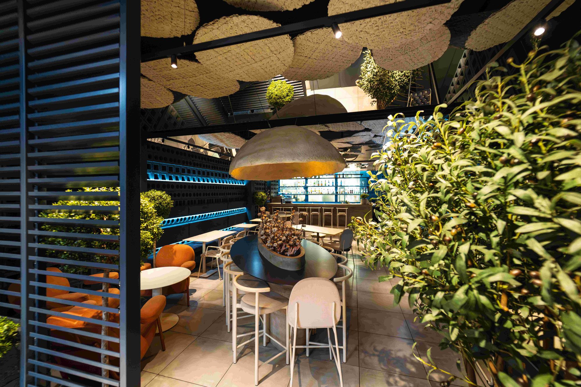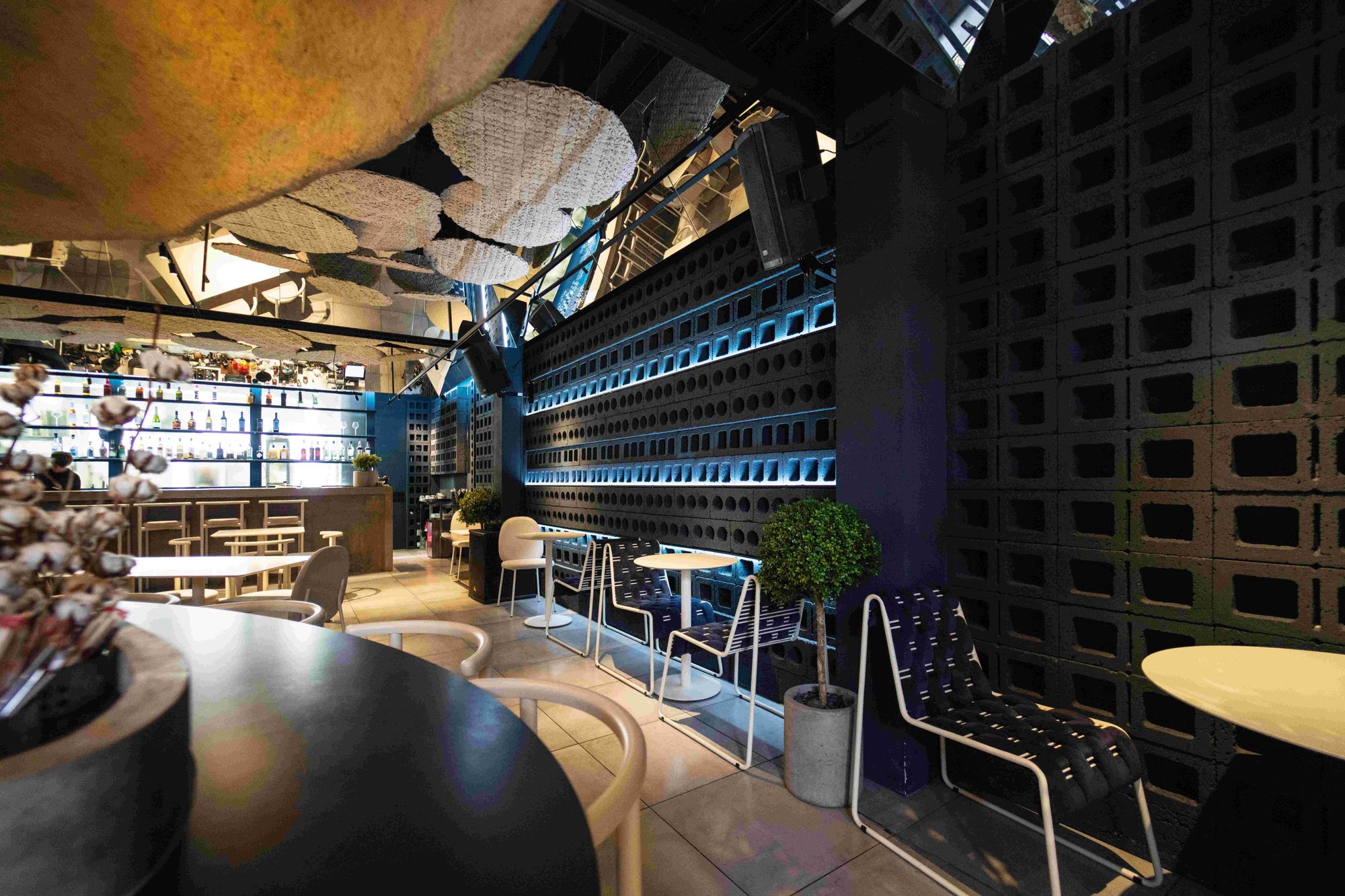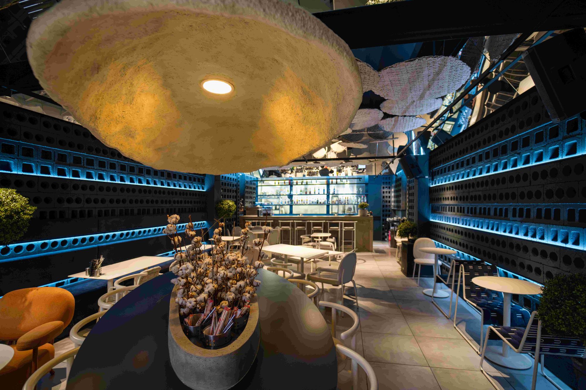 Помимо линейных светильников MAG DOTS, команда использовала споты MAG, даунлайты MS ATLAS и продукт серии DL-BL backlit, который обыграла с помощью объемного плафона необычной формы. Купол выполняет не только декоративную функцию, но еще помогает приглушить звуки и создать акустический комфорт в ресторане.