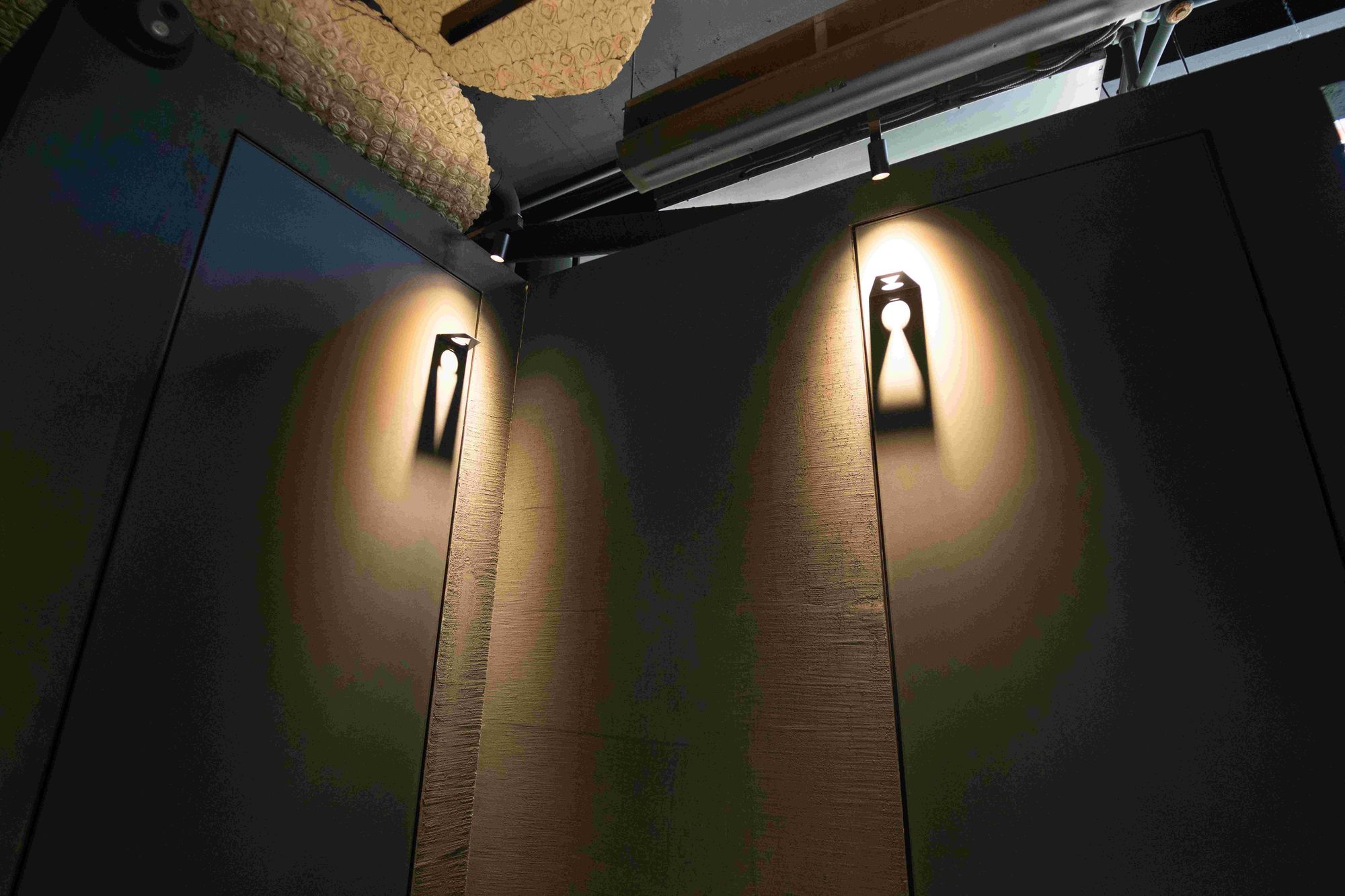 Нашлось место и для других креативных решений. Так, дизайнеры подсветили инсталляцию из… прессованных яичных сот на потолке. А символы, обозначающие санузел, выделяет игра света и тени.