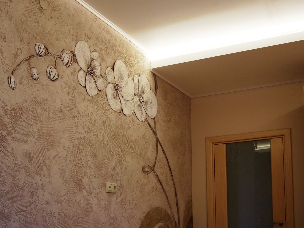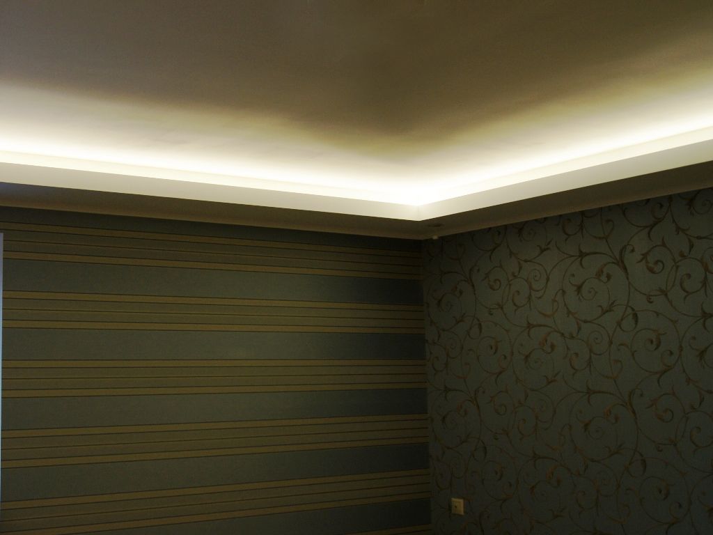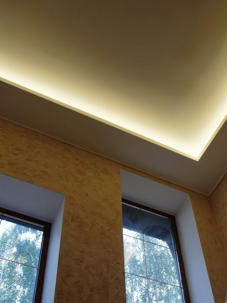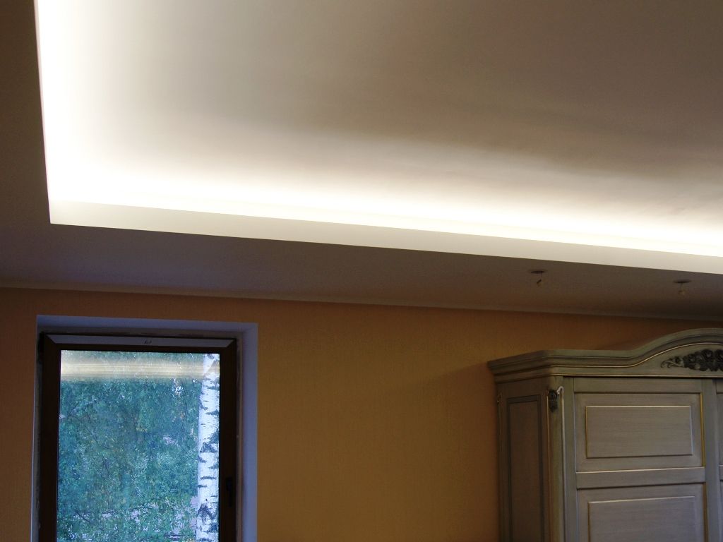 Скрытая светодиодная подсветка, установленная за гипсокартонным потолком, дает мягкий равномерный рассеянный свет. Применение диммеров arlight® в сочетании с яркими двухрядными светодиодными лентами arlight® двойной плотности позволяет использовать светодиодные источники света как для основного освещения, так и для контурной подсветки потолков. Размещение центральной люстры или точечных светильников со светодиодными лампами arlight® создает еще большую гибкость системы освещения.