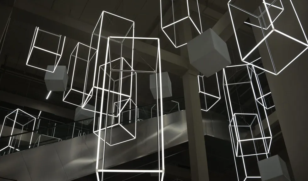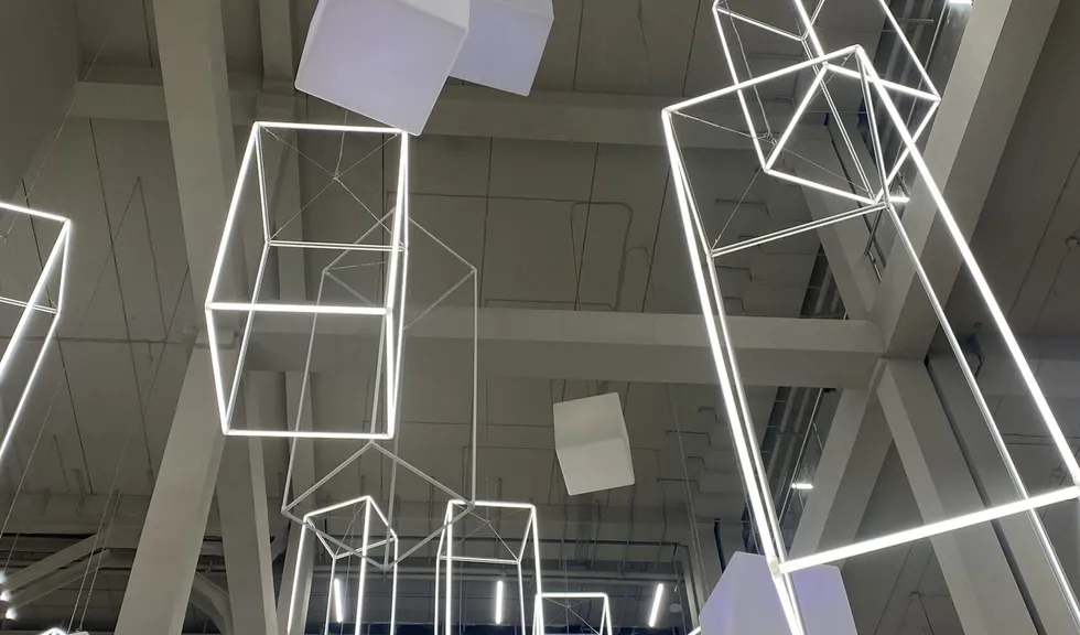 С этой целью для атриума торгового центра «Парк» были созданы светодиодные инсталляции в форме параллелепипедов. Подвесные конструкции со светящимися гранями смотрятся оригинально и воздушно: они заполняют пространство атриума, перекликаясь с другими кубическими элементами дизайна.