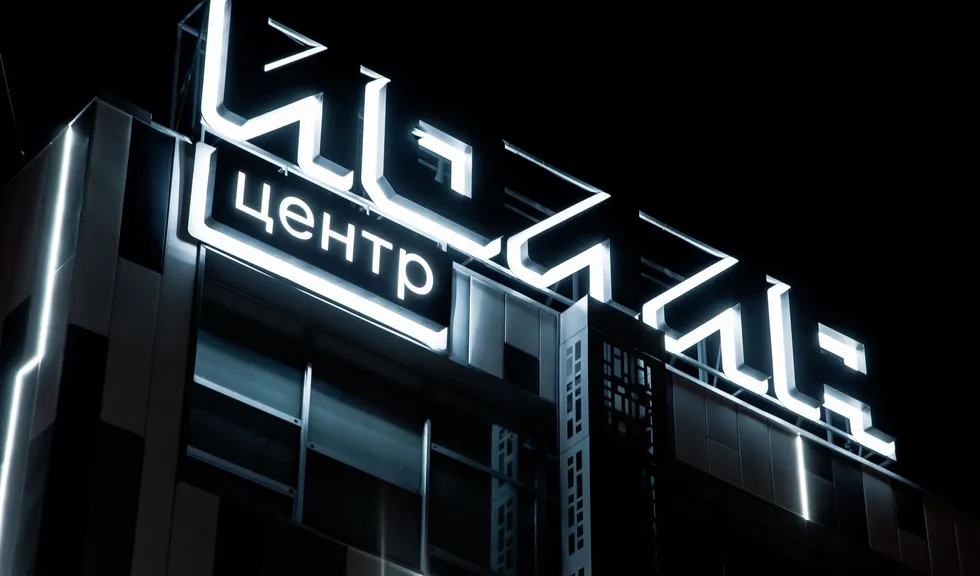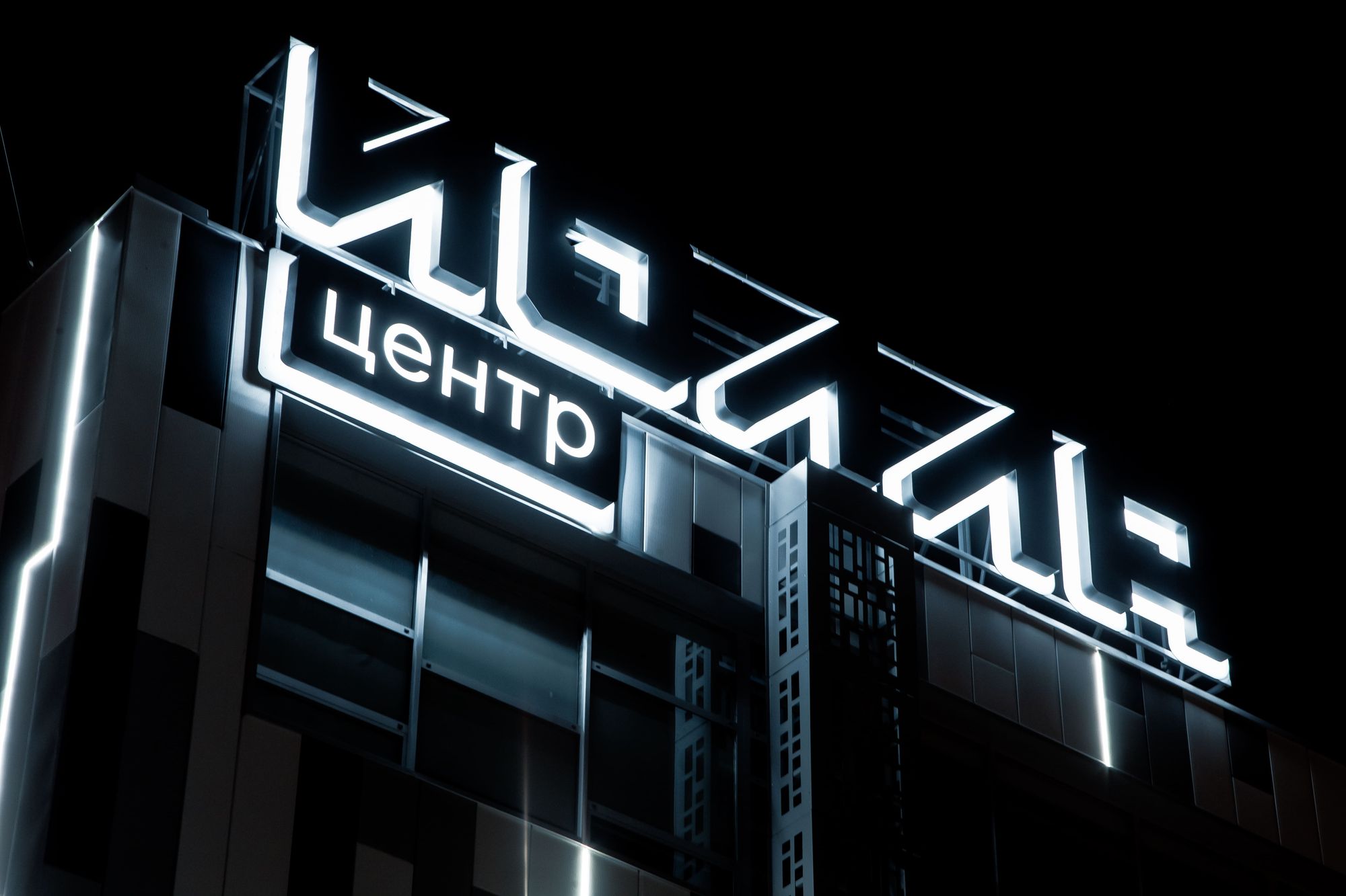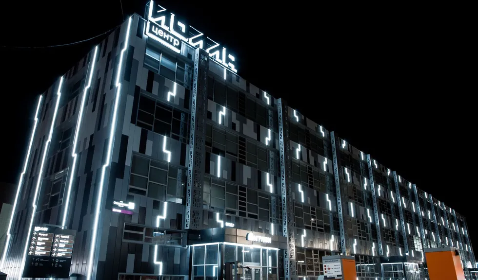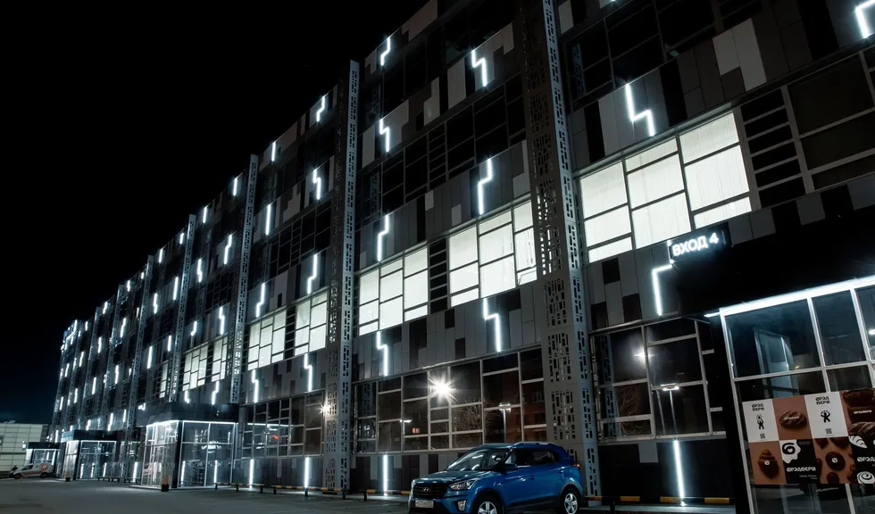 Однотонная подсветка выполнена в холодном цвете свечения (6000 К). Данная цветовая температура гармонирует с серо-голубой гаммой облицовки фасада, а также придает зданию выдержанность.