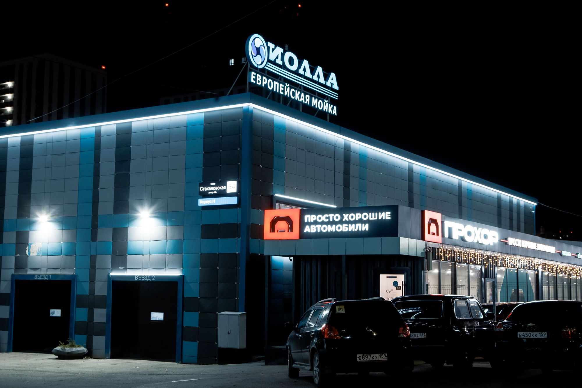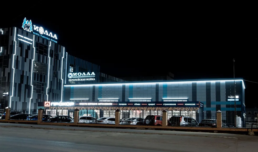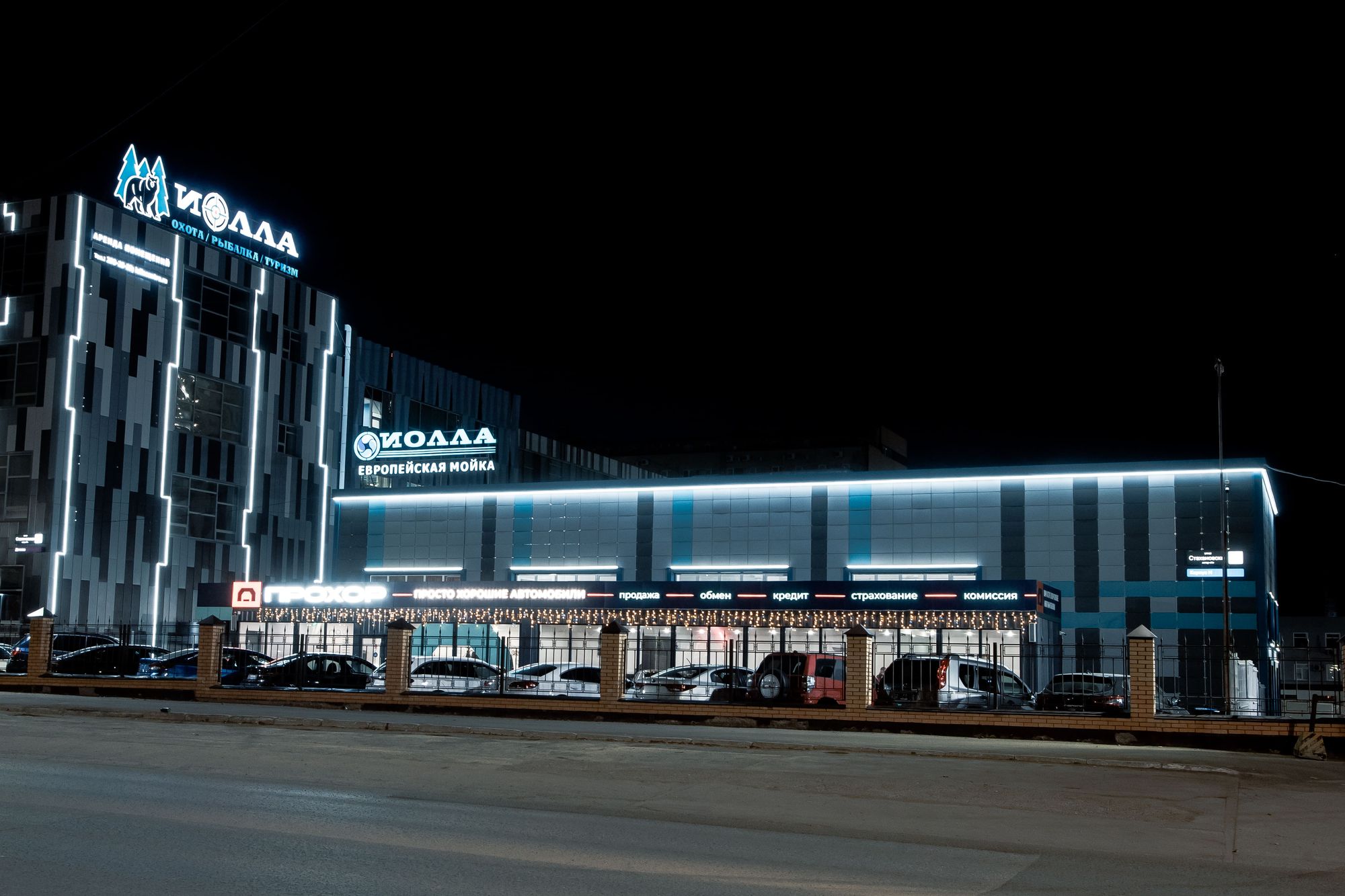 На основе гибкого неона ARL NEON с боковым свечением была реализована подсветка торгового центра «ИОЛЛА» в Перми. Вертикальные линии света на фасаде подчеркивают прямоугольную форму облицовочной плитки, тем самым создавая оригинальный геометрический рисунок в темное время суток. Изгибы под прямым углом образуют строгую форму, которая подчеркивает функциональную направленность торгового центра. Кроме того, вертикальные линии визуально делают здание выше. На контрасте другой корпус торгового центра очерчен горизонтальной контурной подсветкой.